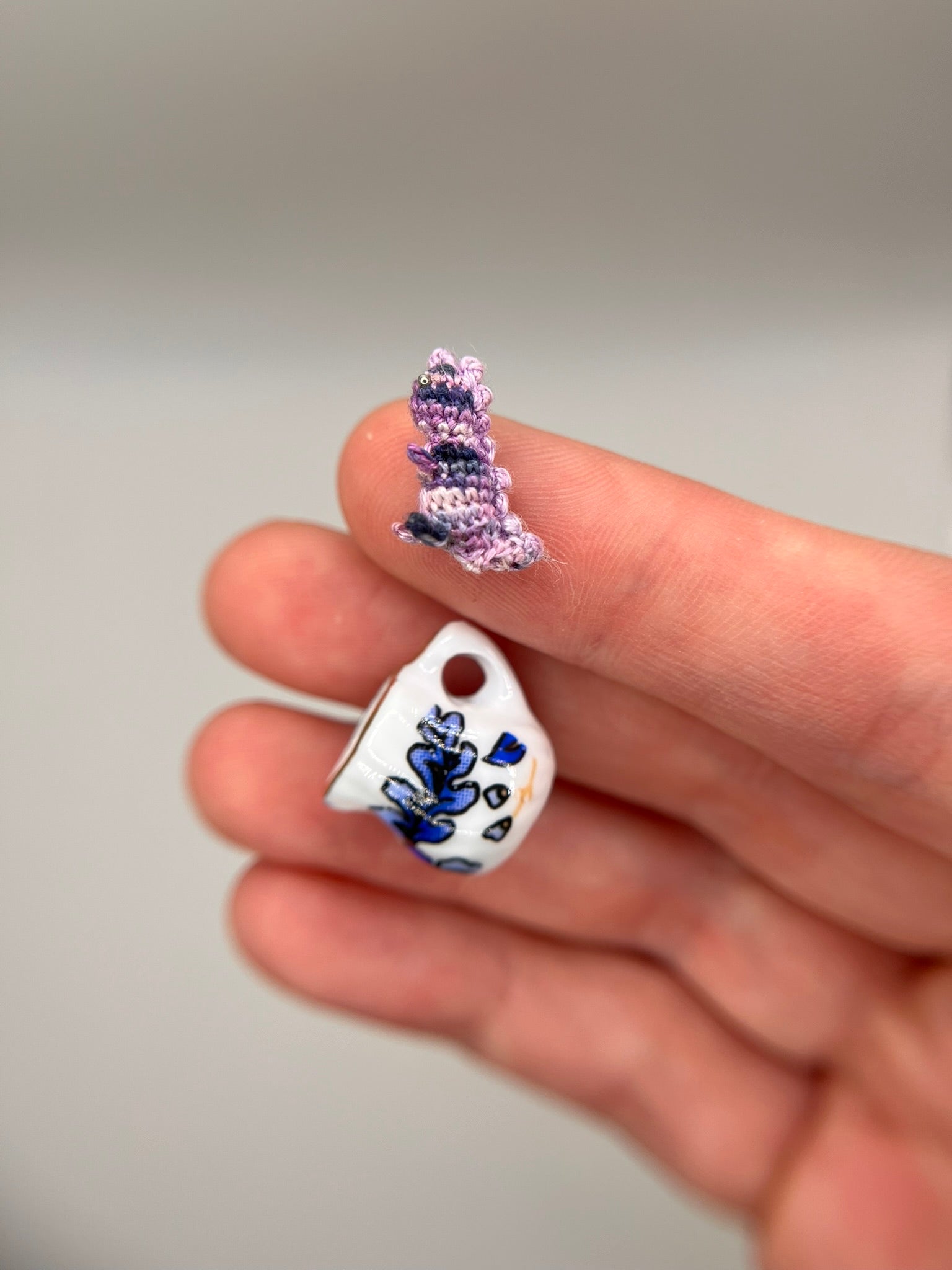 Meet Periwyn, a regal purple dino who’s claimed a delicate blue-flowered tea pitcher as her throne. Hand-crocheted with a 0.5 mm hook and fine thread, every stitch was lovingly hand-woven and will make you smile!