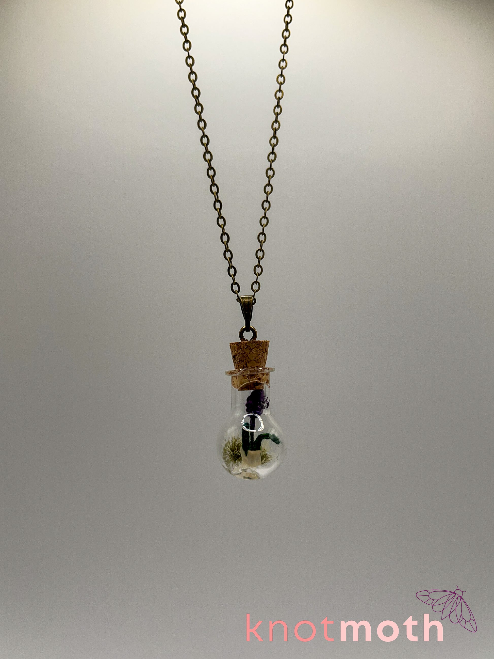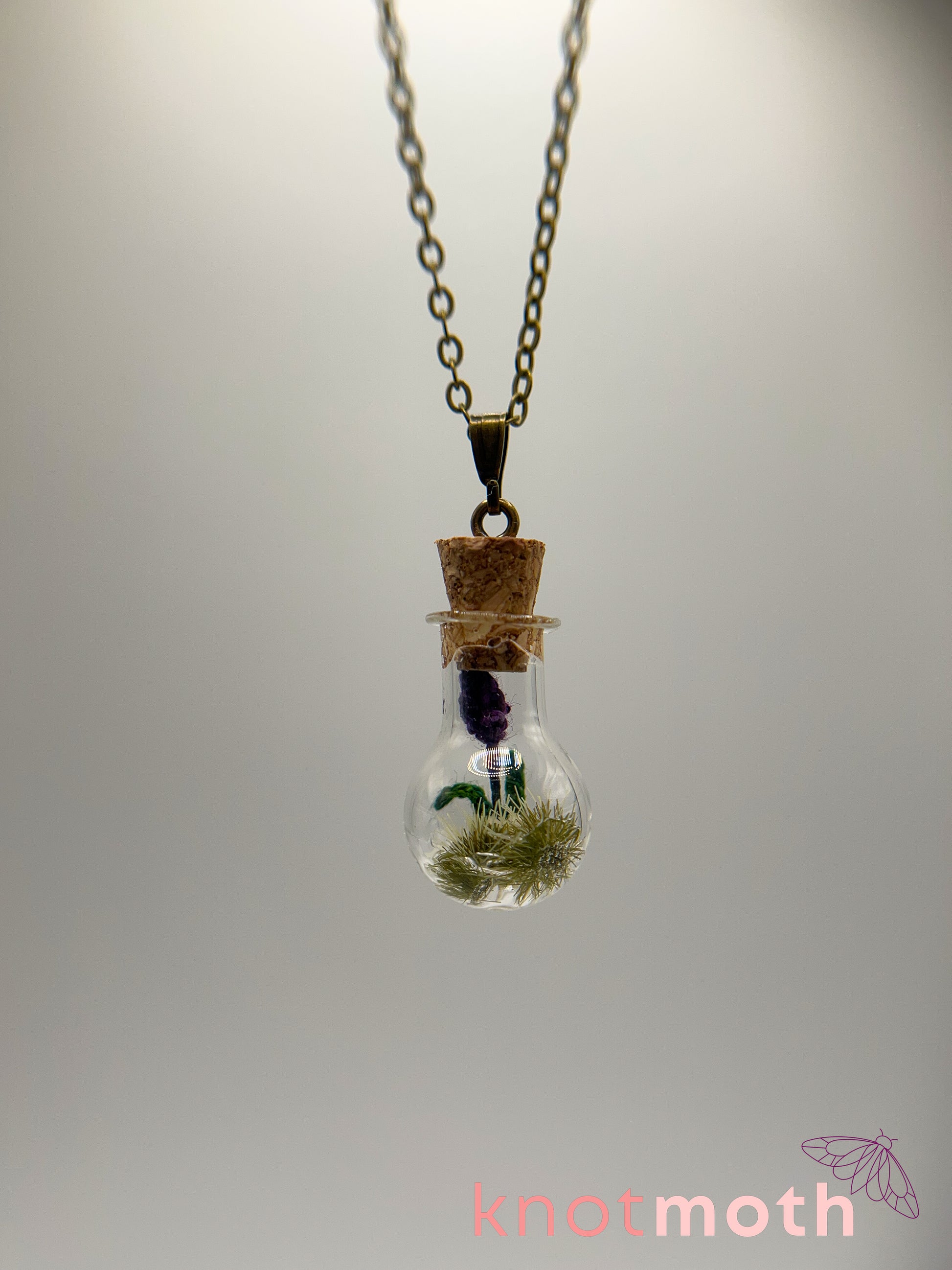 This one-of-a-kind micro-crochet mini jar necklace with lavender flowers and a tiny vertebra bone ethically sourced from dissected owl pellets is the perfect accessory for anyone who loves beautifully macabre handmade jewelry!