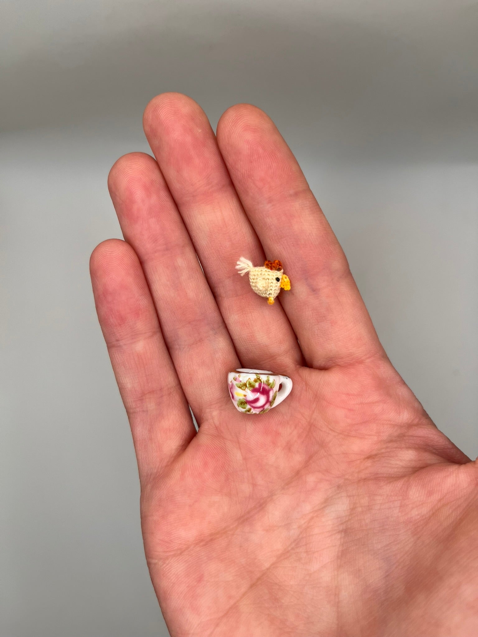 Posie is a cream-colored chick who adores soft tea-time chatter. Hand-crocheted with a 0.5 mm hook and thread, she perches perfectly in her pink flower teacup, always ready to make you smile!