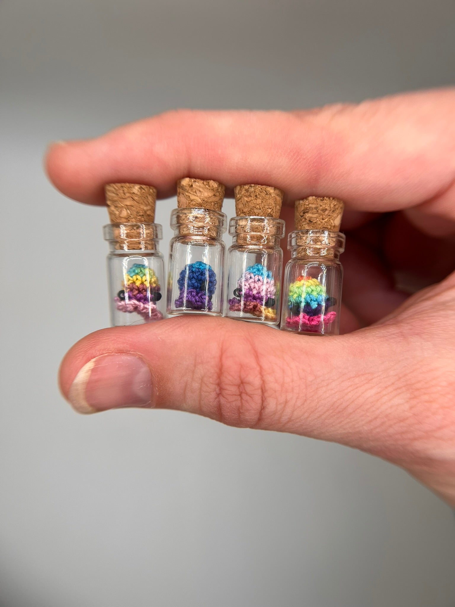 Meet Luneth, Pipka, Mori, and Rumi - four gentle spirits who prefer cozy jars to haunted houses. Each tiny ghost is hand-crocheted with fine thread and a 0.5 mm hook, capturing soft little swirls and smiles in microscopic detail.