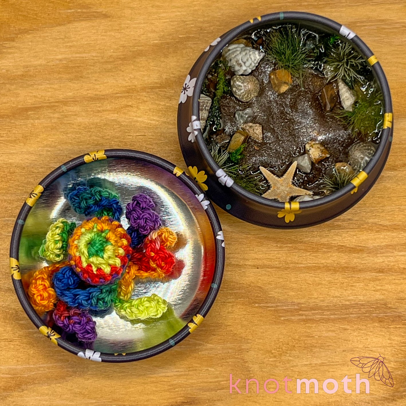 The micro-plushie is made with thread and a 1.0 mm crochet hook, and the tin is decorated to look like a "sandy beach" with crystal chips, fake grass, and seashells. You can take the tiny octopus out of its protective tin and there's a small magnet in the base, so it doubles as a needle-minder or fridge decoration!