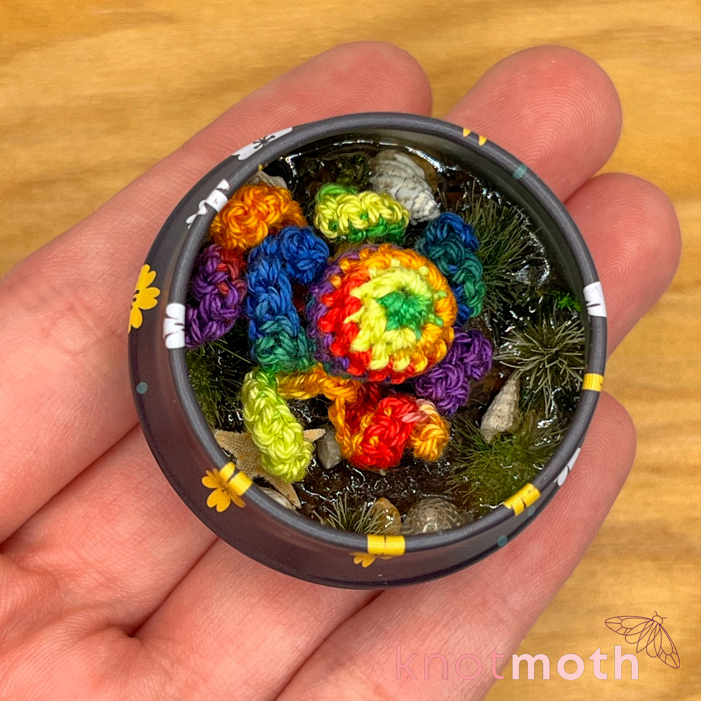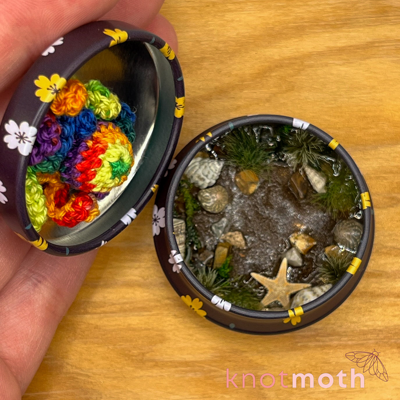 This charming micro crochet rainbow octopus trinket tin makes a delightful addition to any adorable ocean lover's miniature art collection!