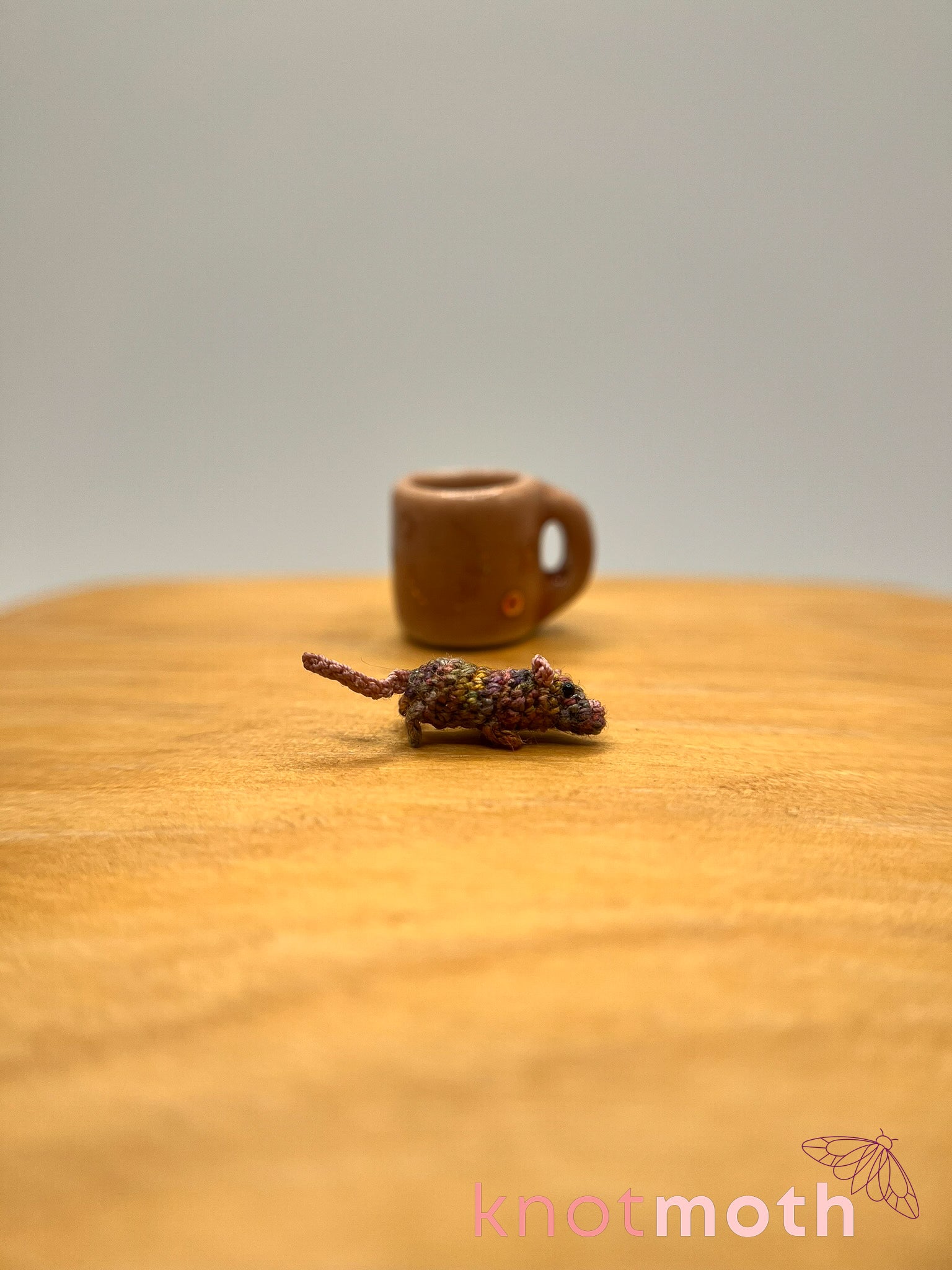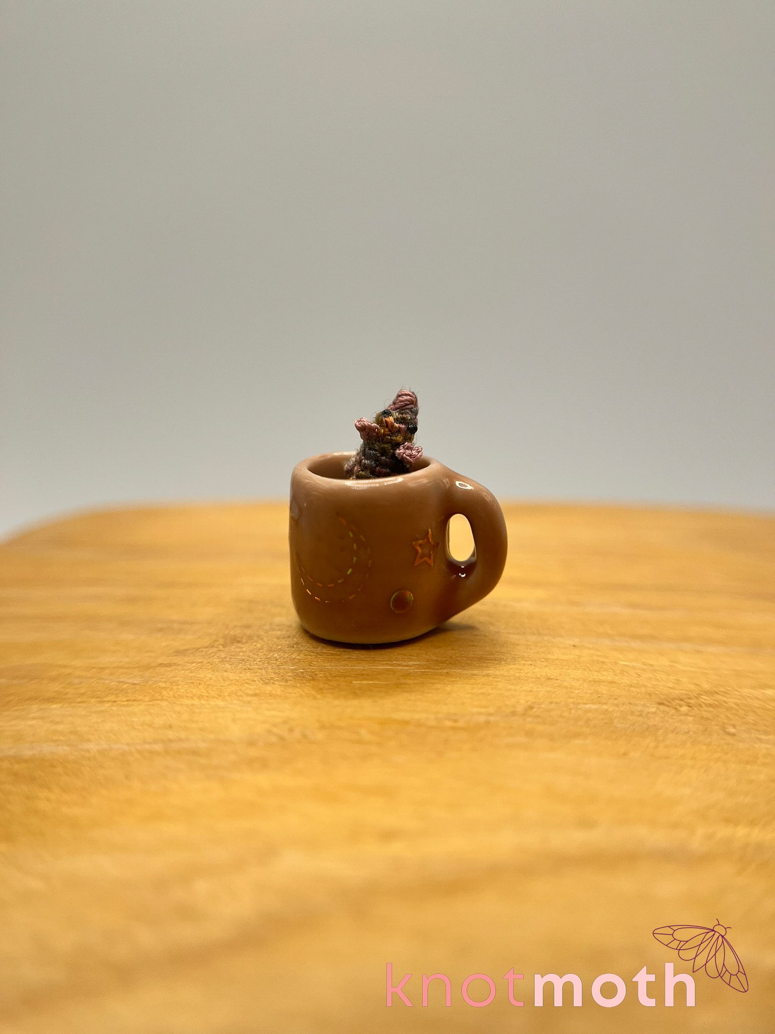 This micro-crochet rat mug is the perfect handmade trinket for anyone who loves miniature fiber art! Meticulously stitched with hand-dyed thread and a 0.5 mm crochet hook, you'll be amazed and charmed by the intricacy and whimsy of this piece.