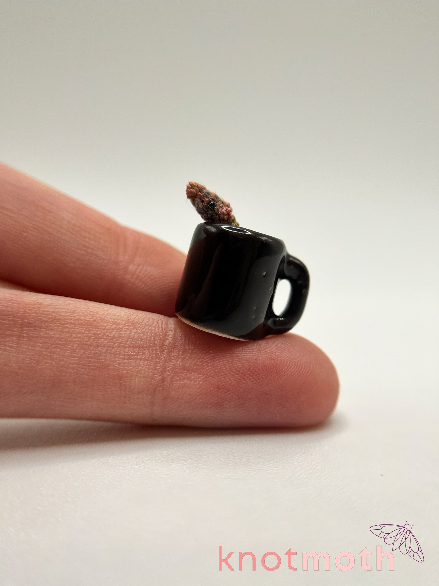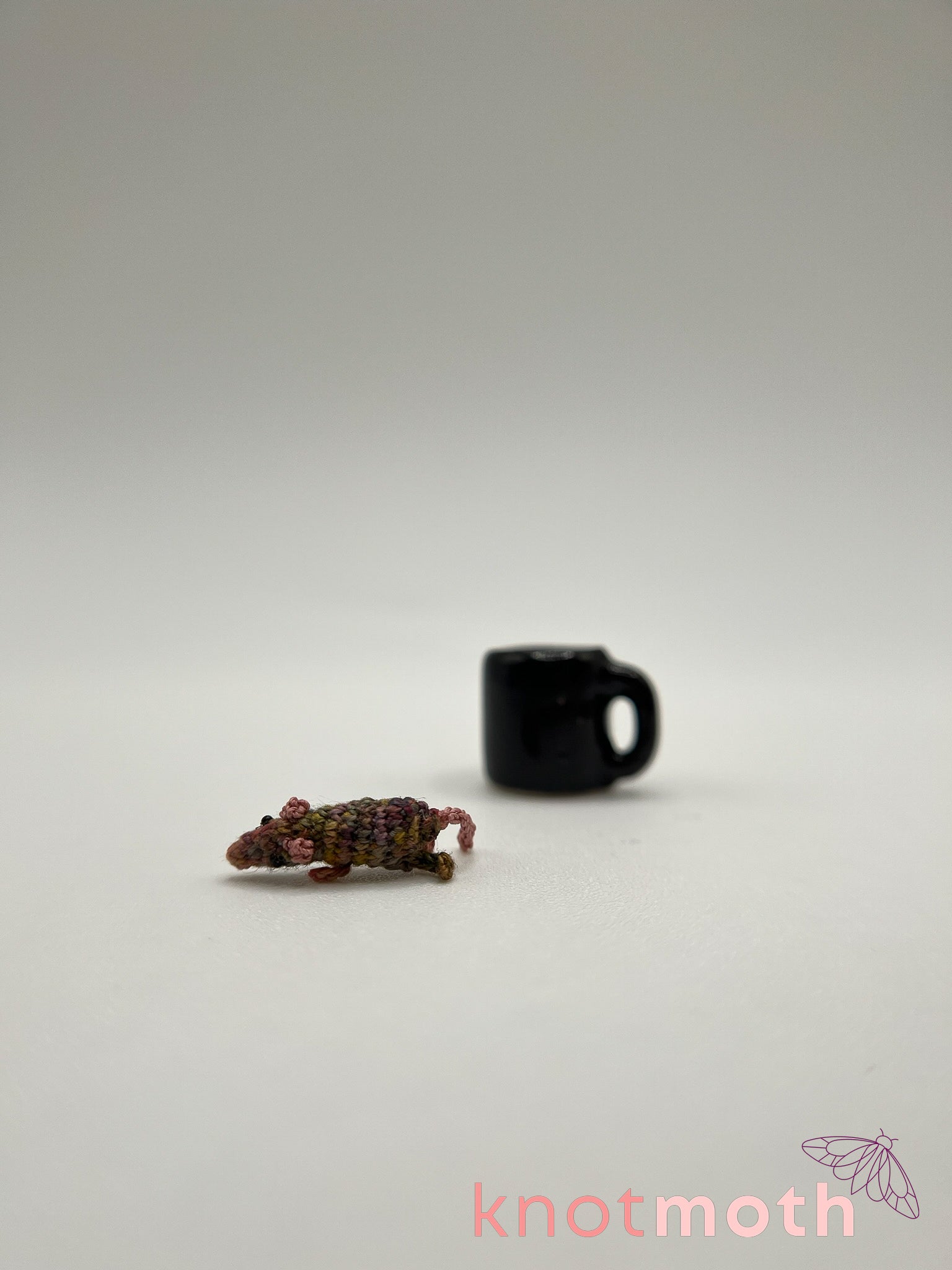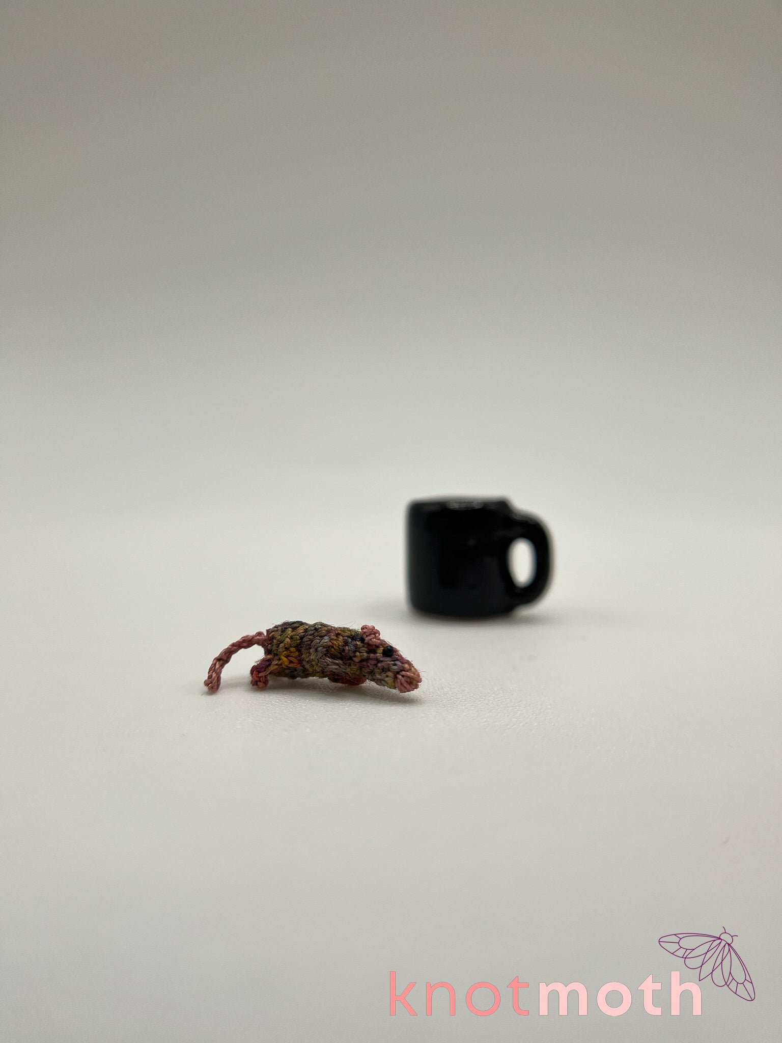 This adorable micro-crochet rat mug was meticulously stitched with hand-dyed thread and a 0.5 mm crochet hook, and the tiny amigurumi snaps to the ceramic mug magnetically for a fun trinket!