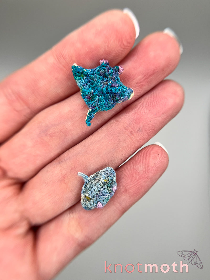 Handmade with thread and a 0.5 mm crochet hook, the amazingly tiny ray and pup snap magnetically to each other and the metal tin with a satisfying click that makes them great as a fidget toy!