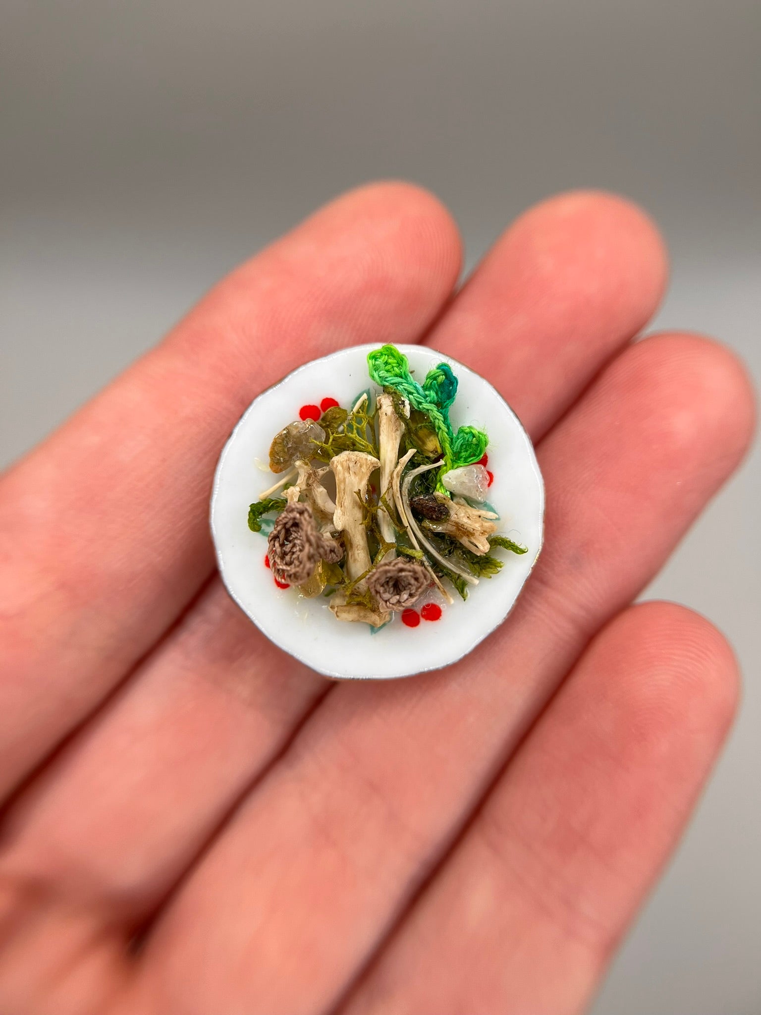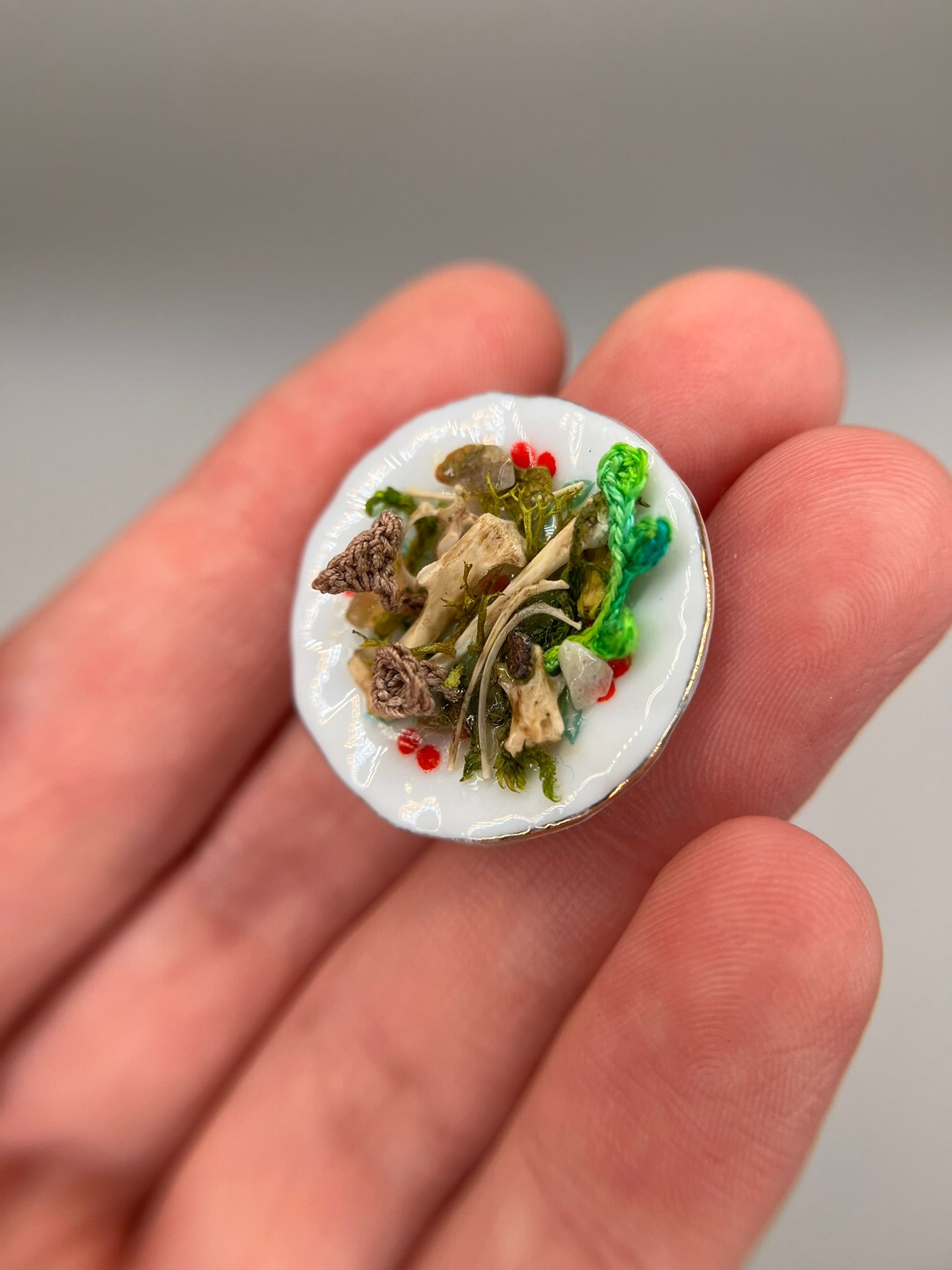 Bones harvested from owl pellets, cotton thread, crystal chips, microbead, moss, glue, miniature ceramic plate, magnet