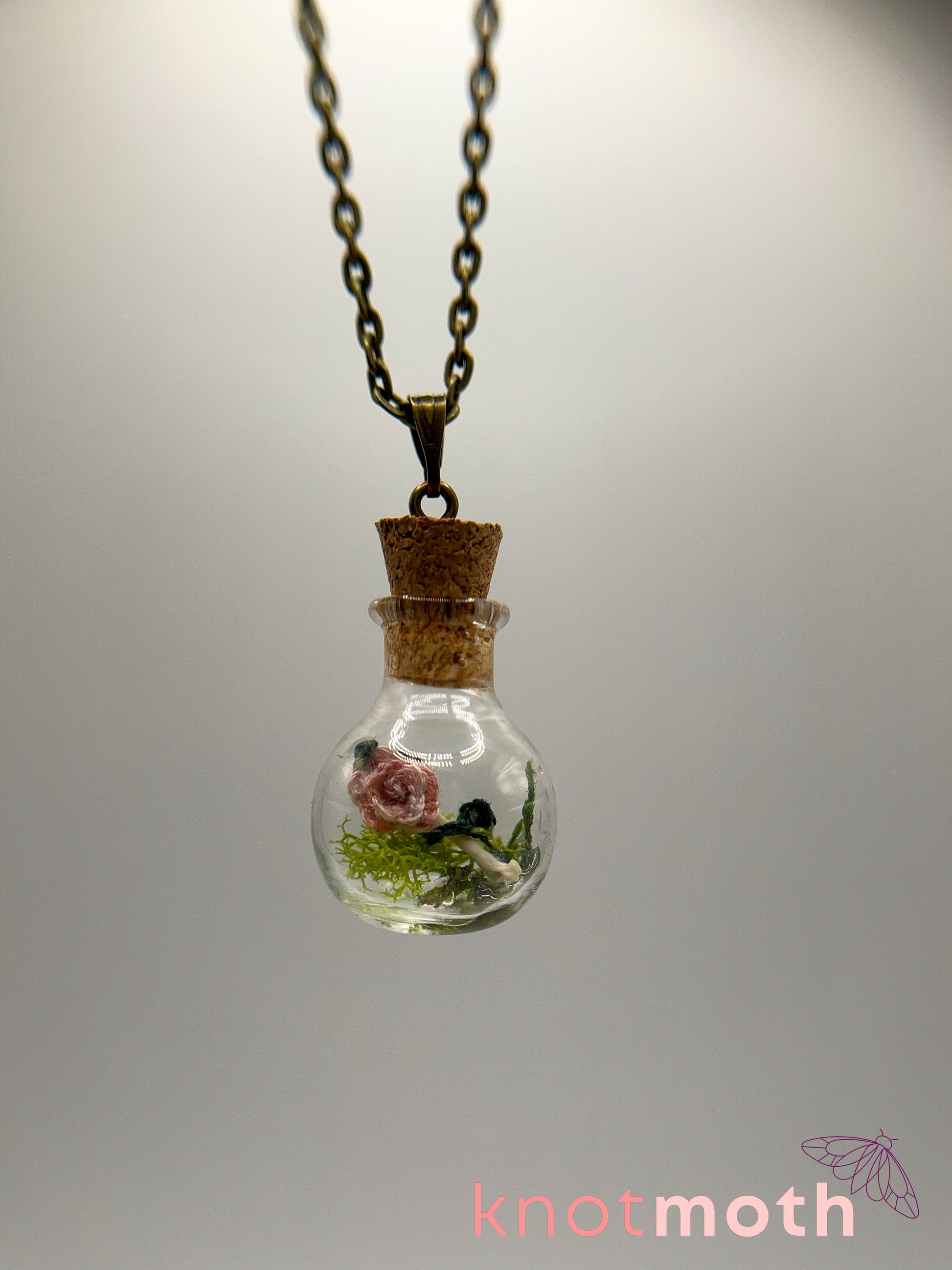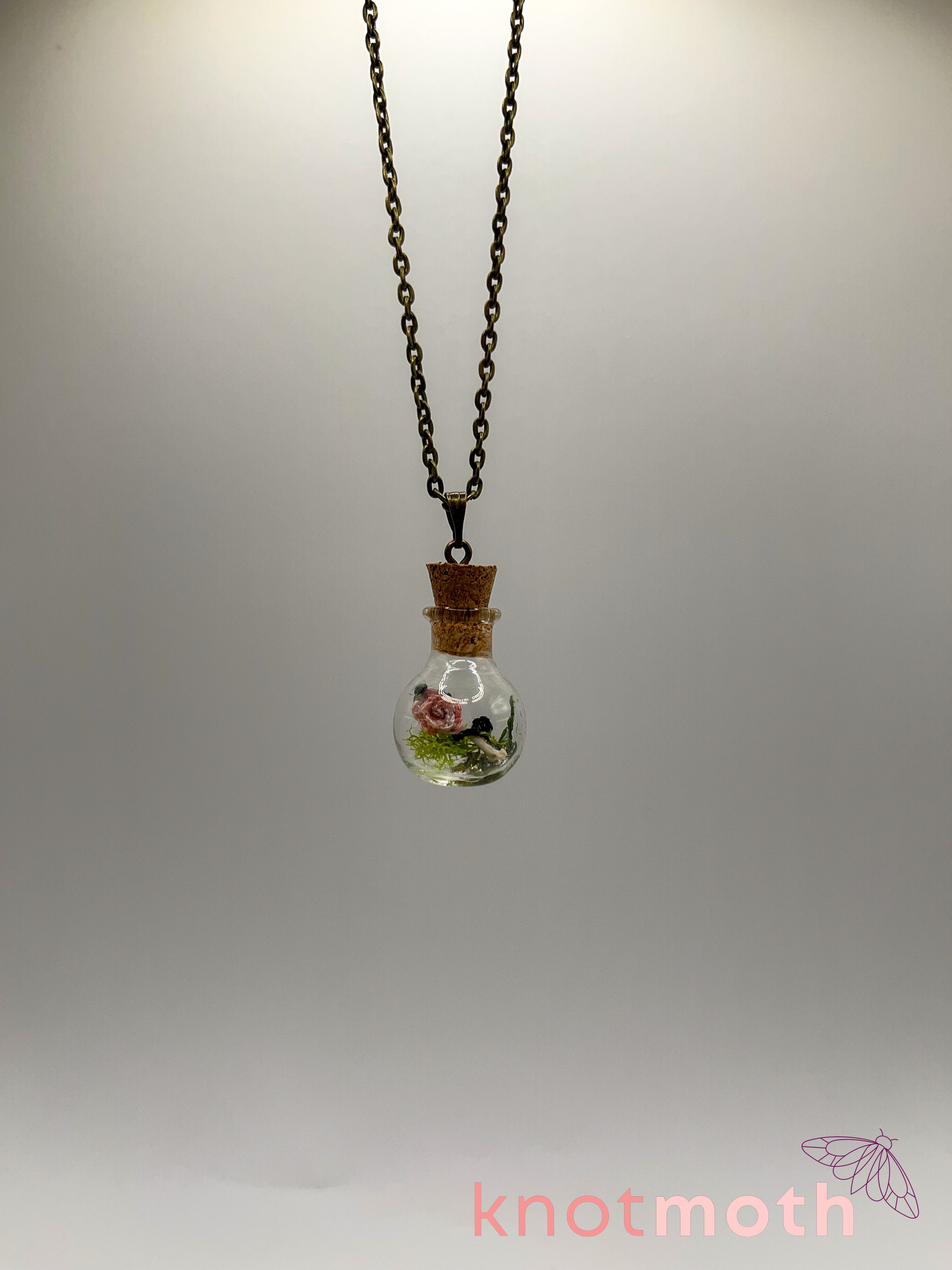 bone dissected from owl pellets, thread, moss, resin glue, zinc alloy metal necklace, metal loop, glass jar with cork