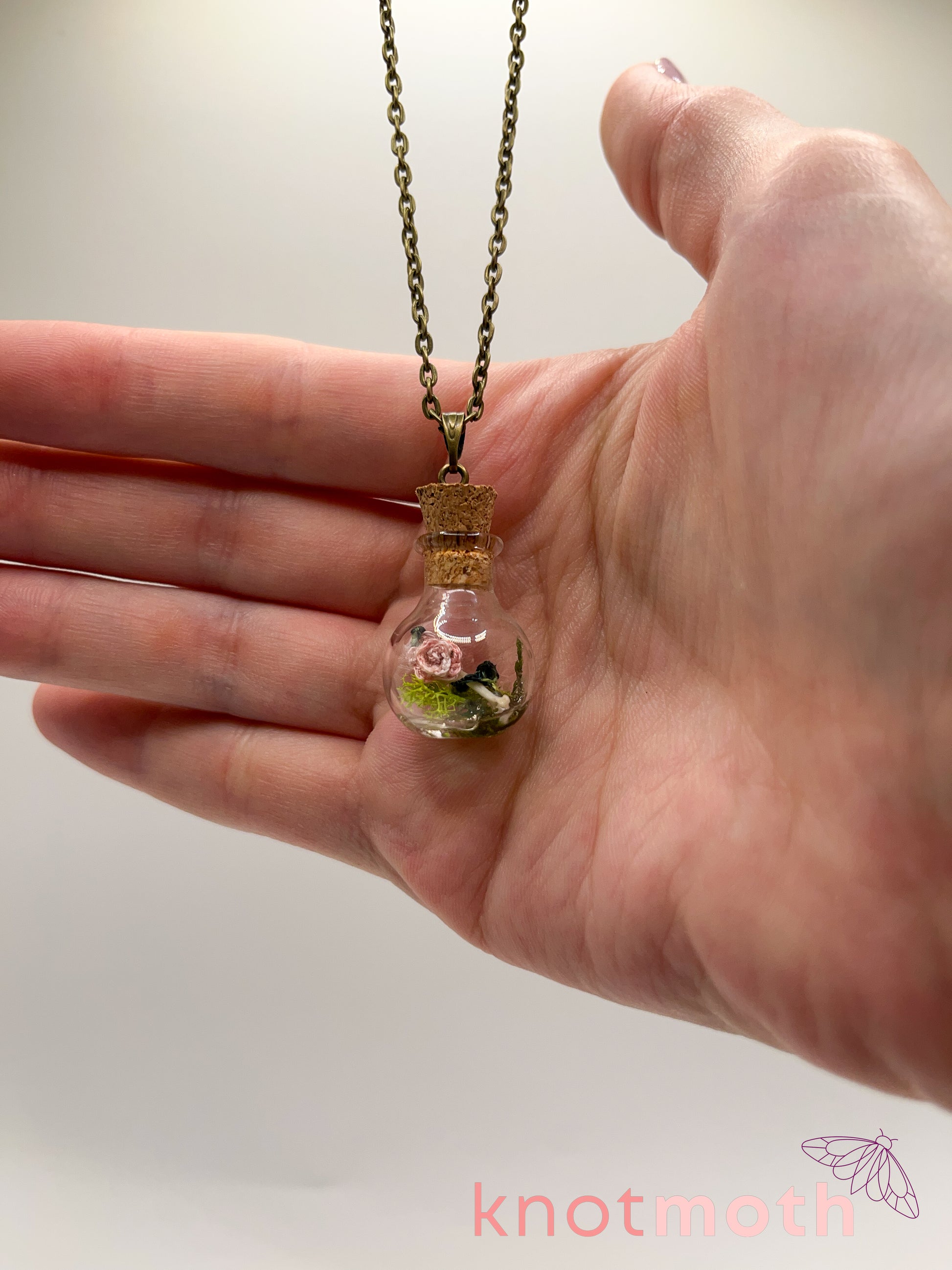This one-of-a-kind micro-crochet mini jar necklace with a pink rose and a tiny humerus bone ethically sourced from dissected owl pellets is the perfect accessory for anyone who loves beautifully macabre handmade jewelry!