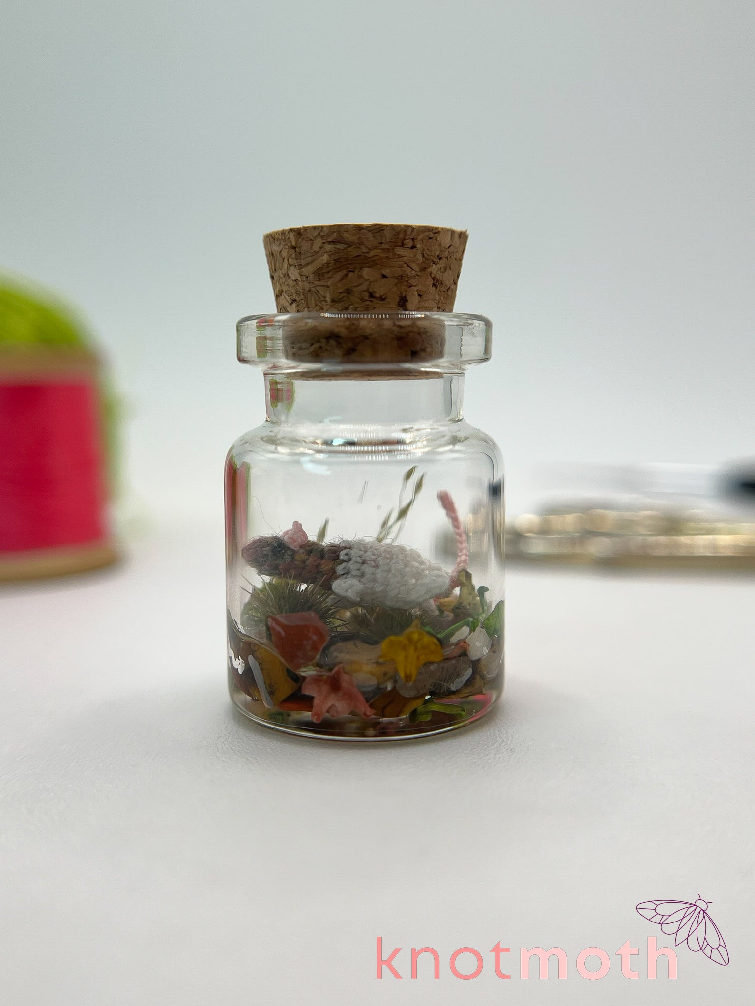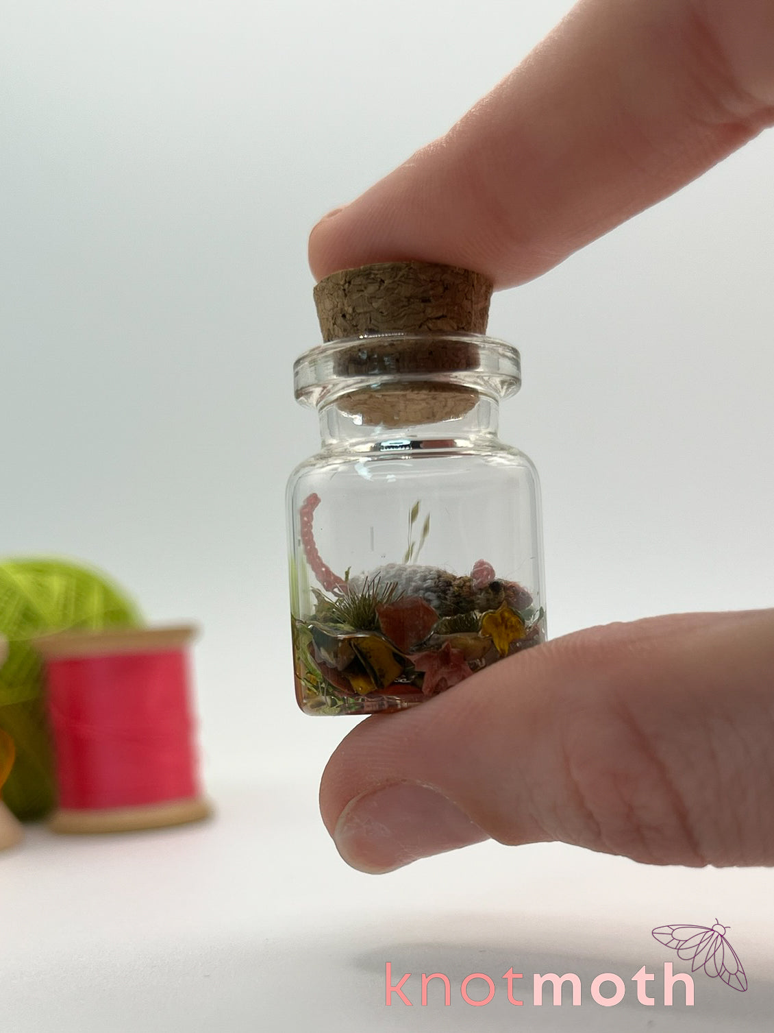 thread, microbeads, crystal chips, fake grass, miniature fake leaves, resin, glue, glass jar, and cork