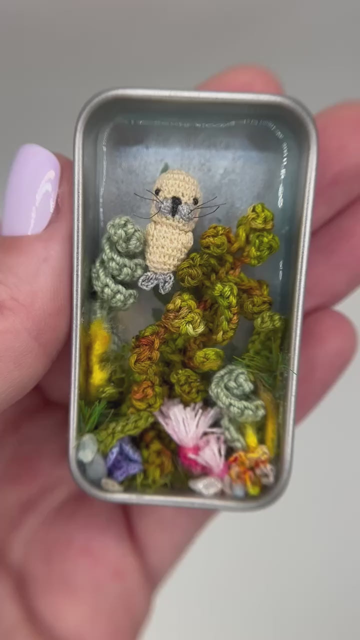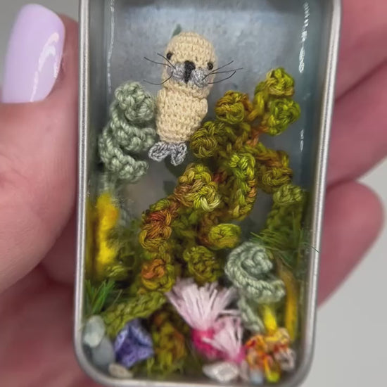 Handmade with thread and a 0.5 mm crochet hook, the amazingly tiny seal snaps magnetically to the metal tin and can be hidden behind the biggest piece of kelp!