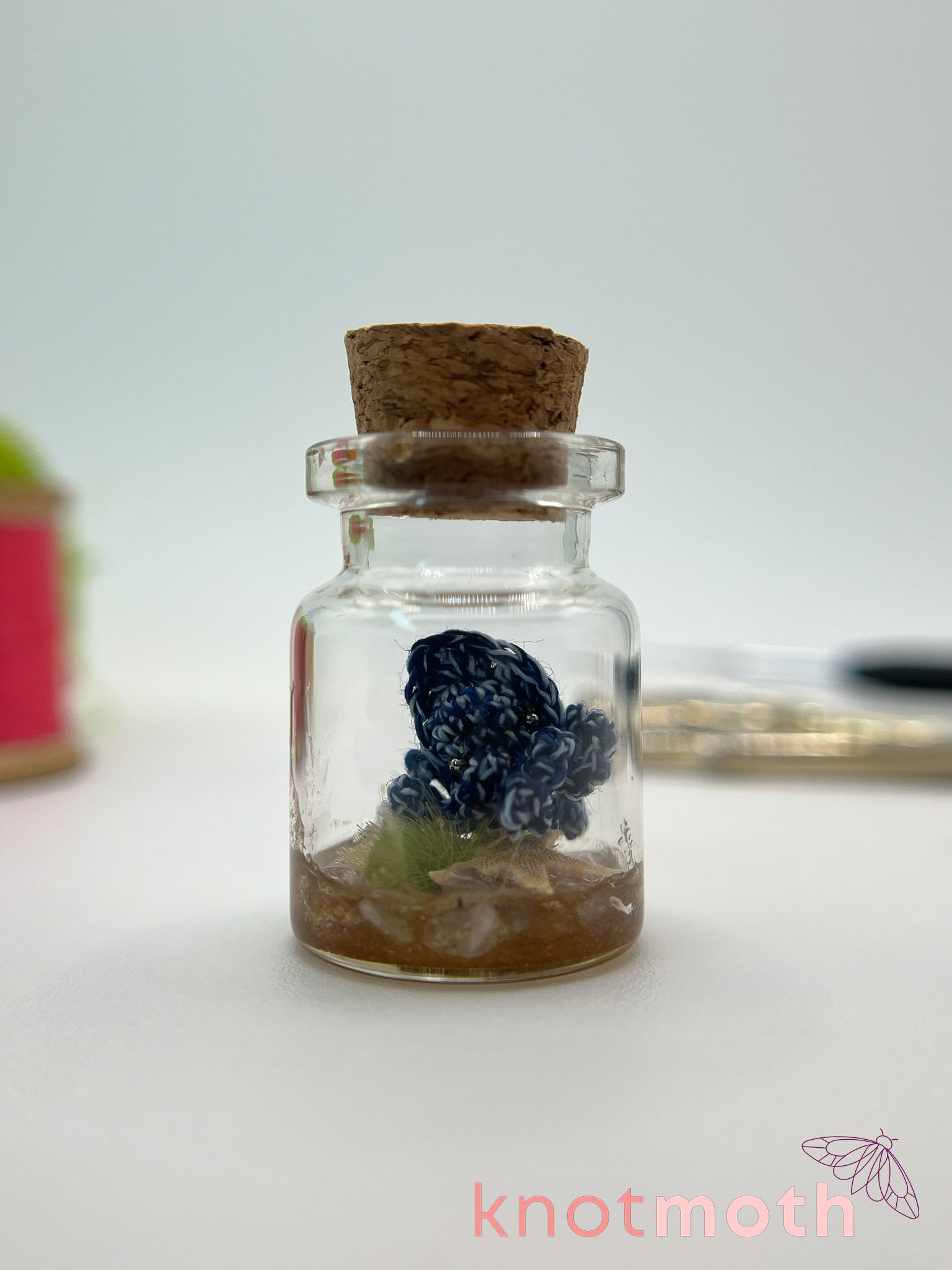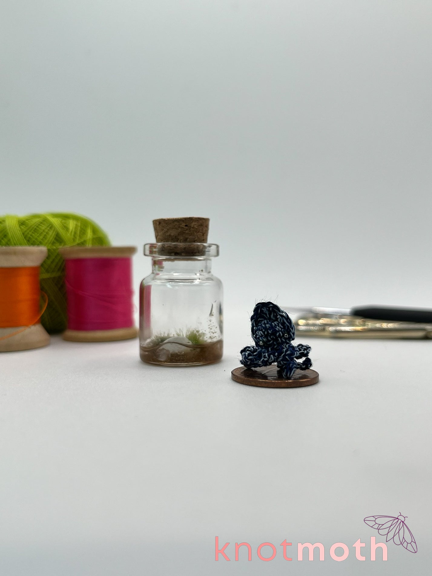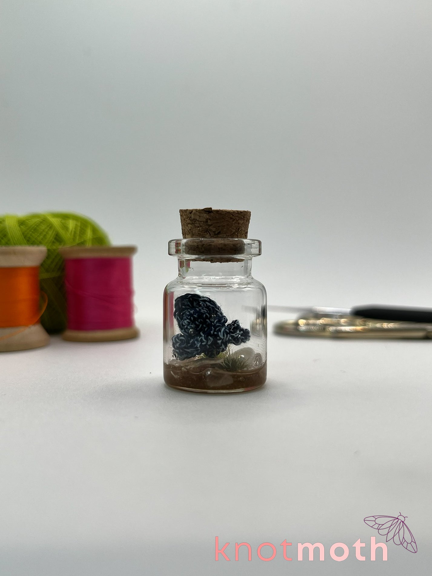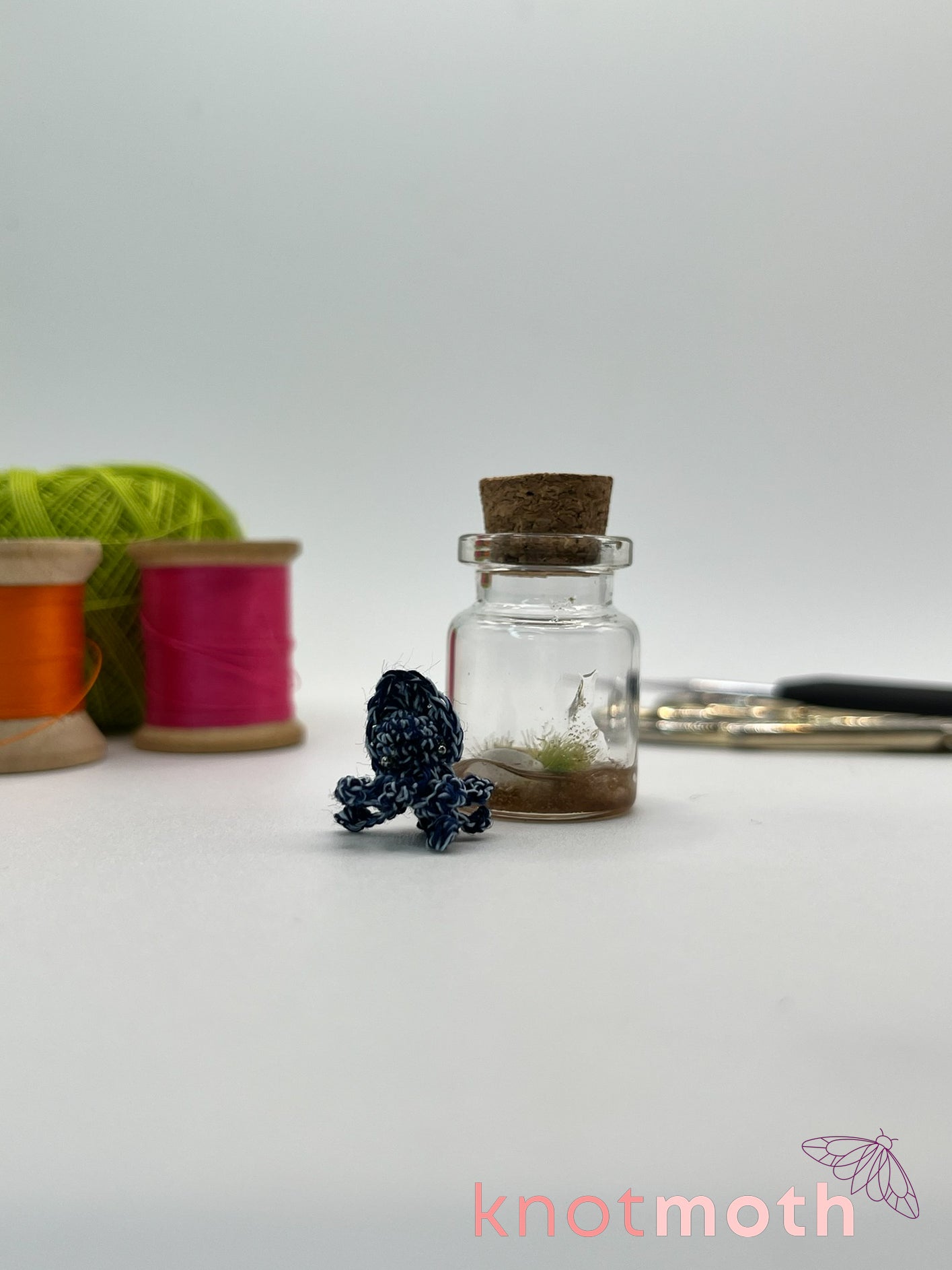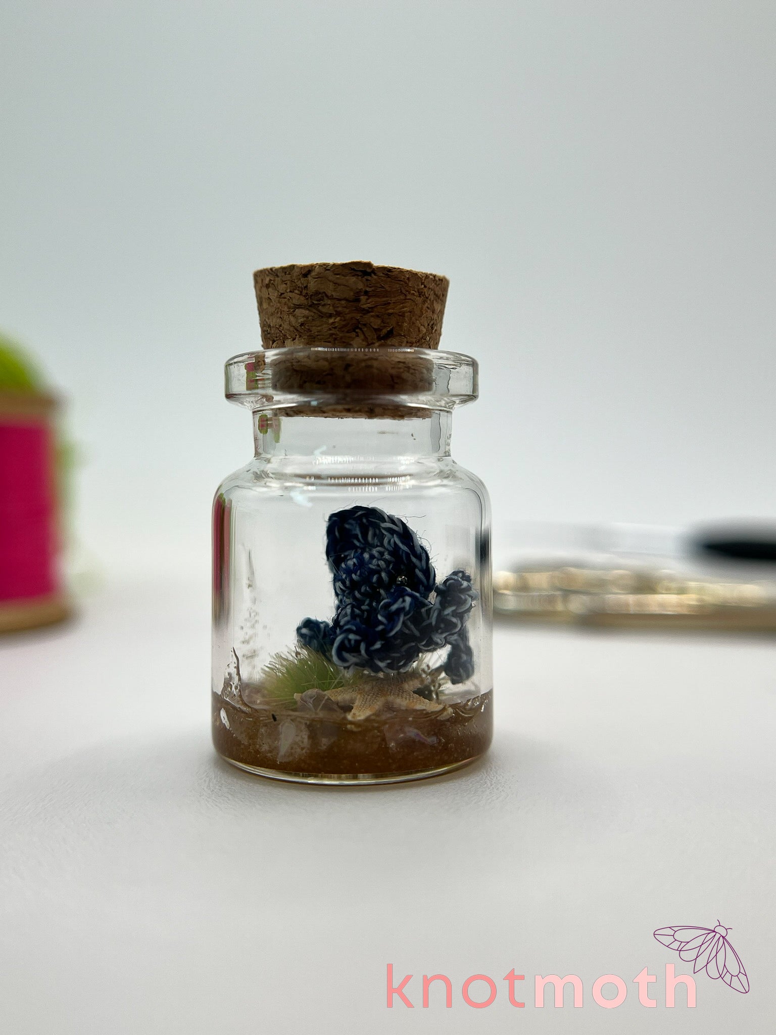 This adorable micro-crochet squid trinket jar made with navy blue and glow-in-the-dark thread rests in a small glass jar decorated with tiny seashells, sand, fake grass, and crystal chips.
