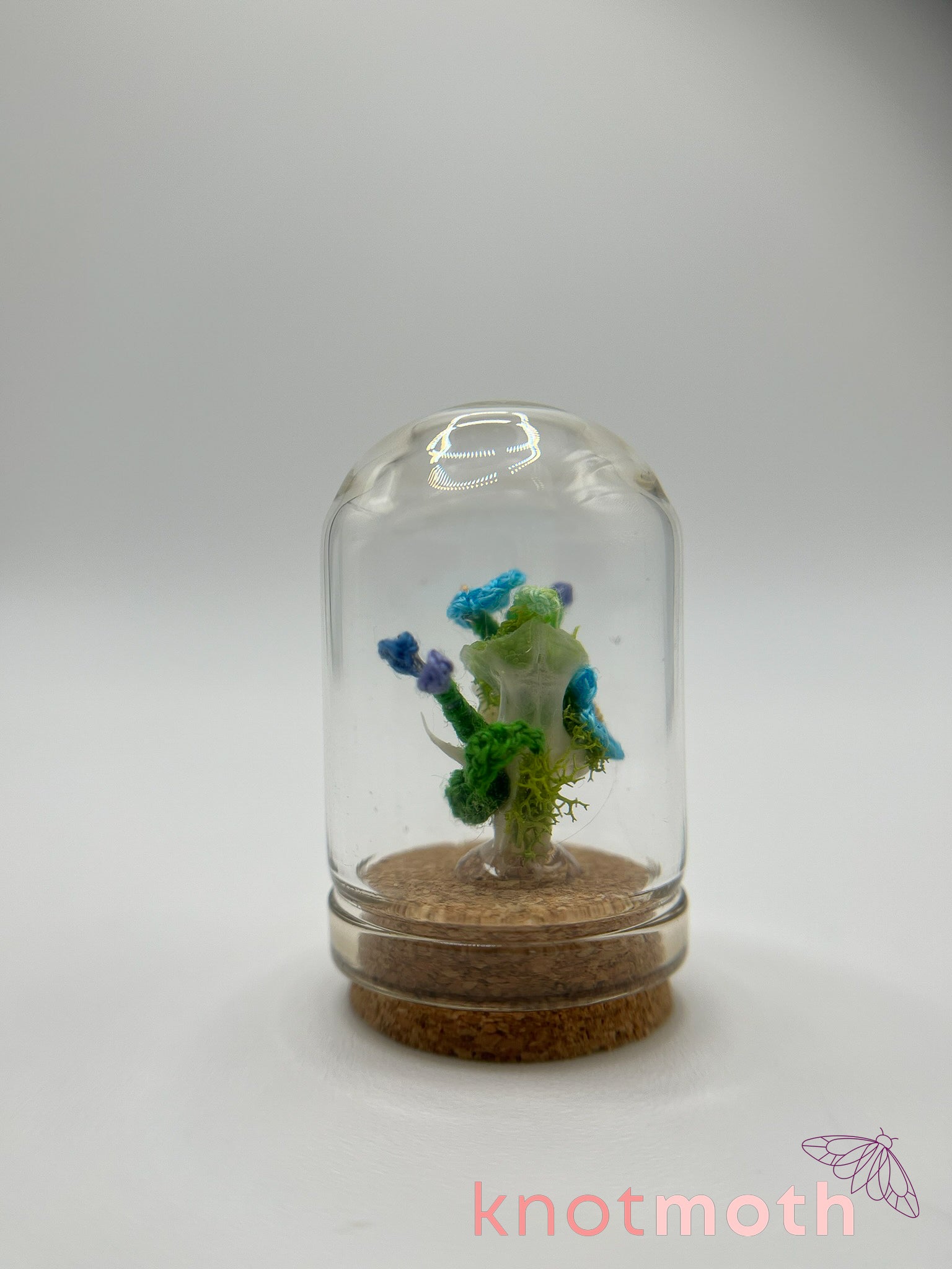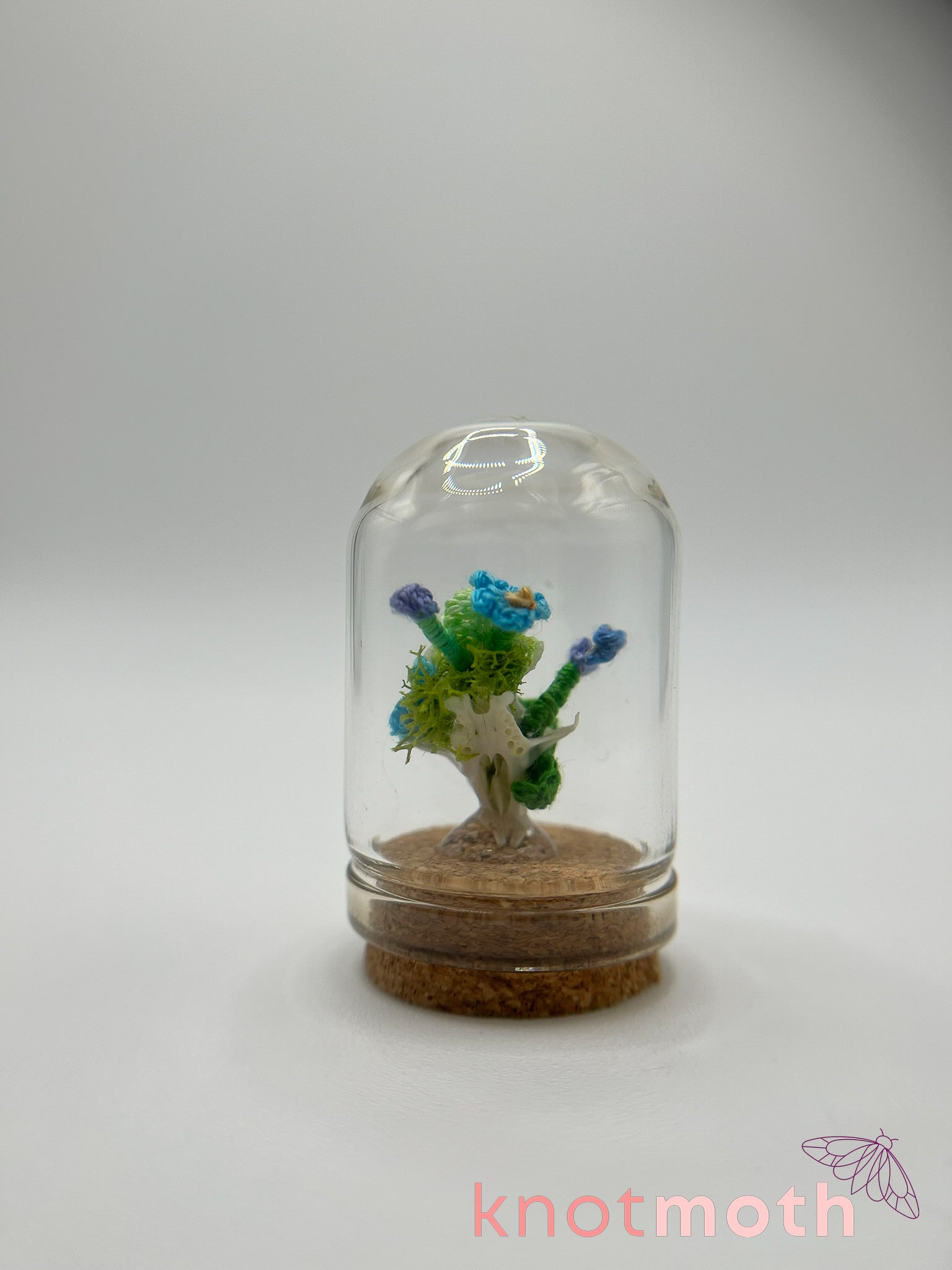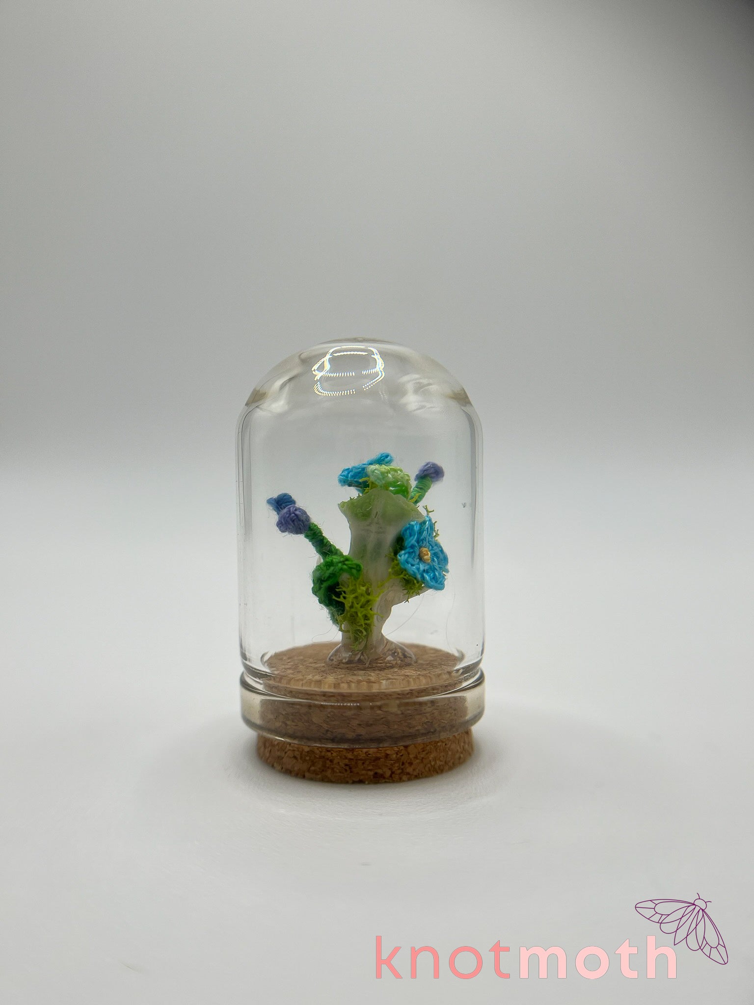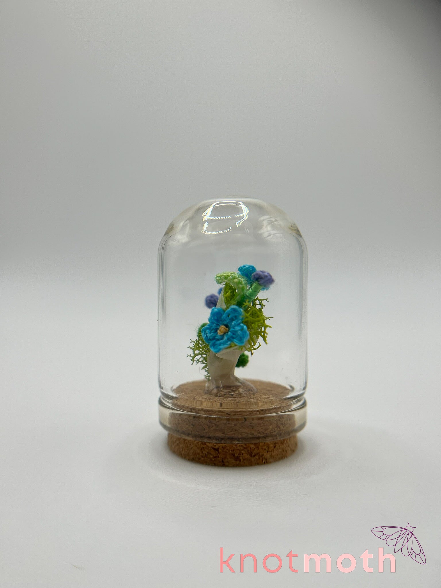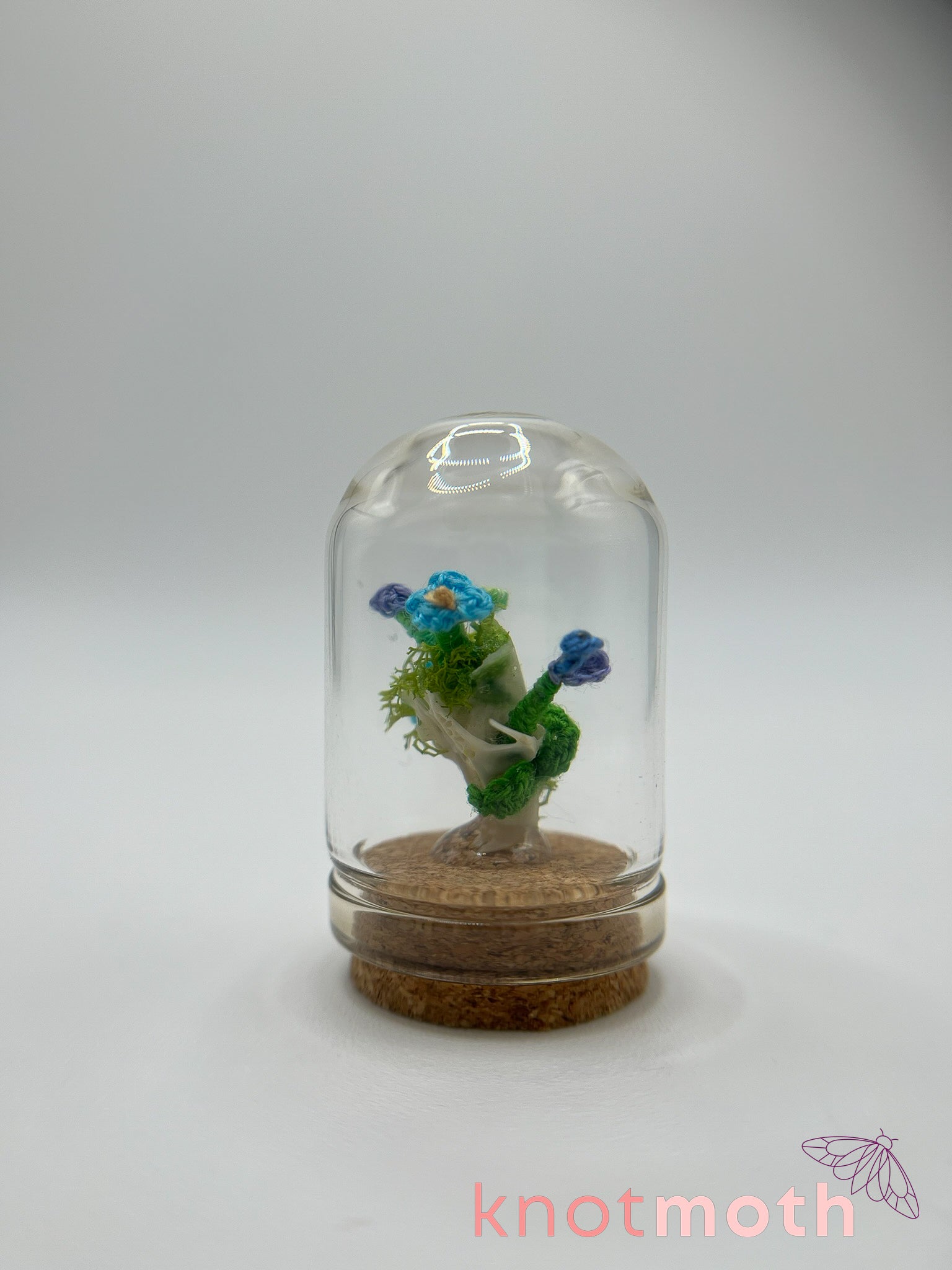 This beautifully macabre cloche jar features handmade micro-crochet forget-me-not flowers and vines "growing" from a tiny ethically sourced skull dissected from an owl pellet.