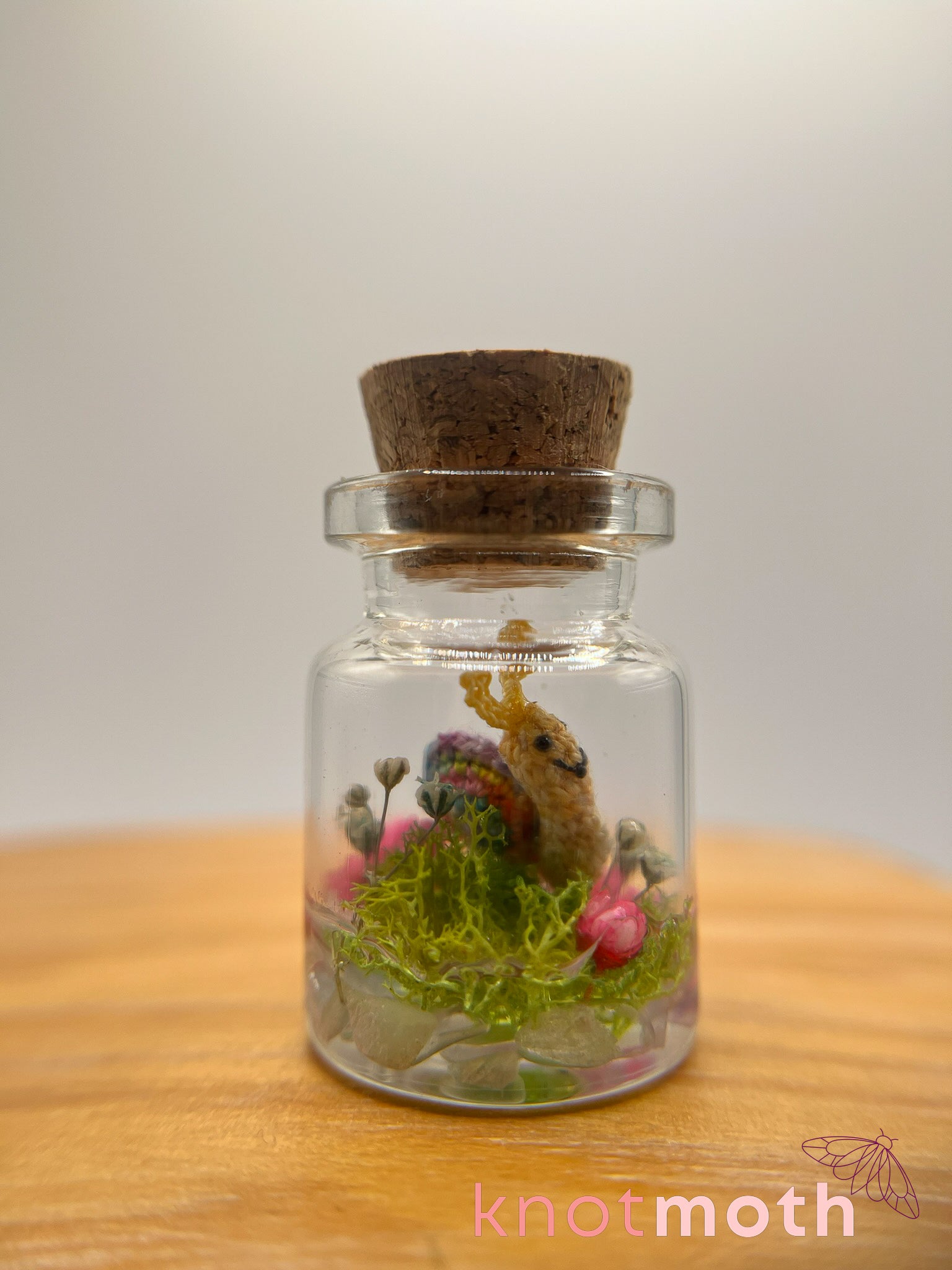 This dainty and intricately detailed micro crochet snail trinket jar is the perfect accessory to show off your love of handmade miniature fiber art! Made with hand-dyed thread and a 0.5 mm crochet hook, the micro-plushie snail rests in a small glass jar decorated with crystal chips, moss, and dried flowers.