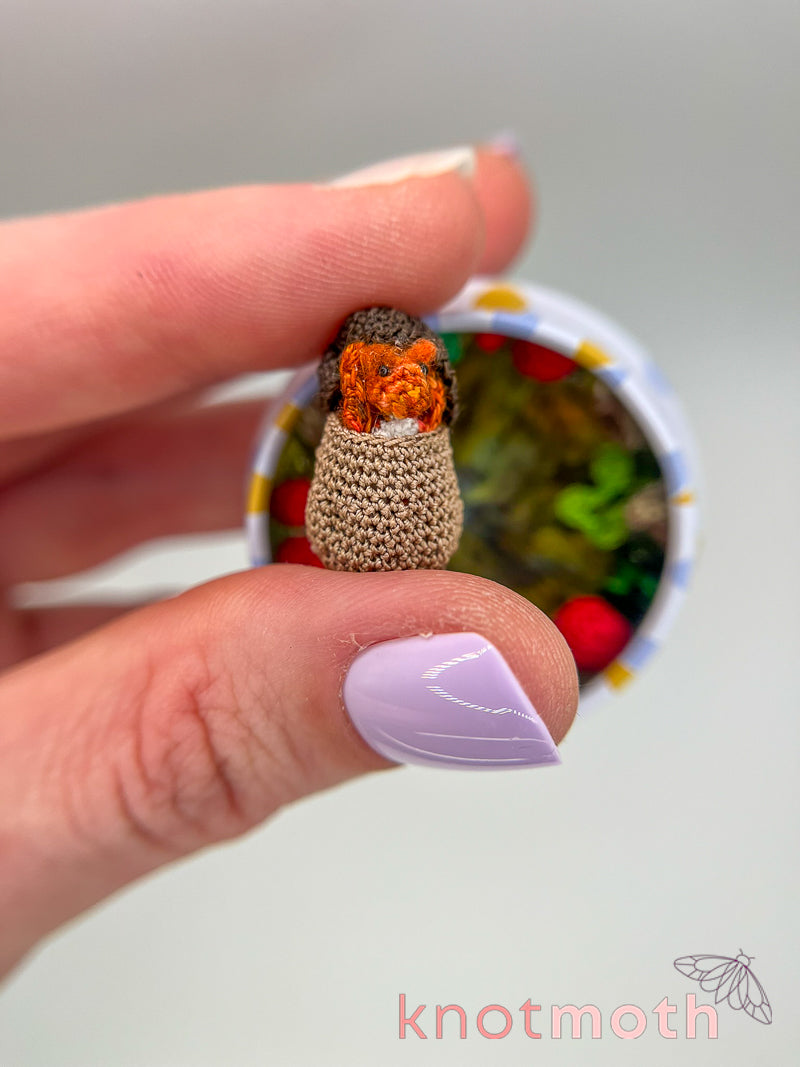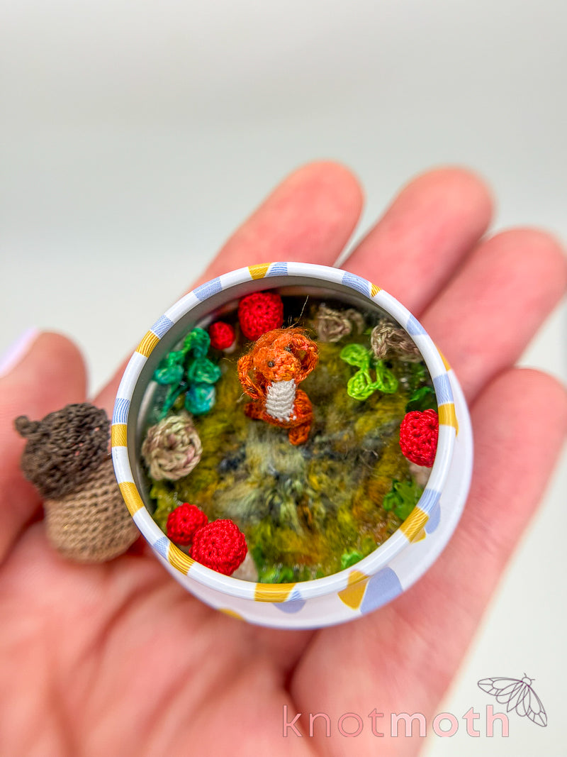 This charming and intricately detailed micro-crochet squirrel, acorn, and mushrooms scene inside a miniature metal tin will make you smile every time you twist off the tin's lid to take a peek, and it's small enough to carry inside your pocket!