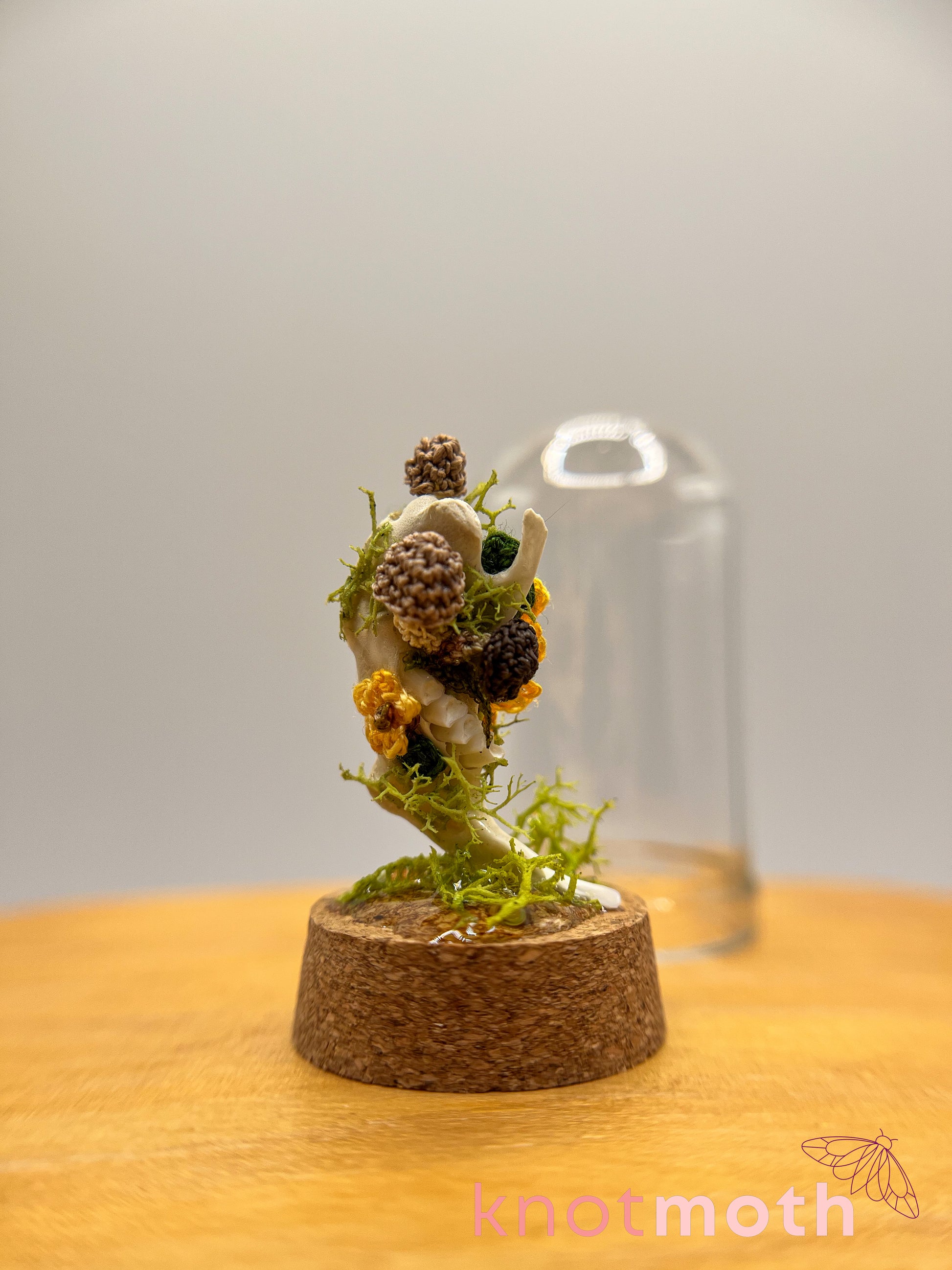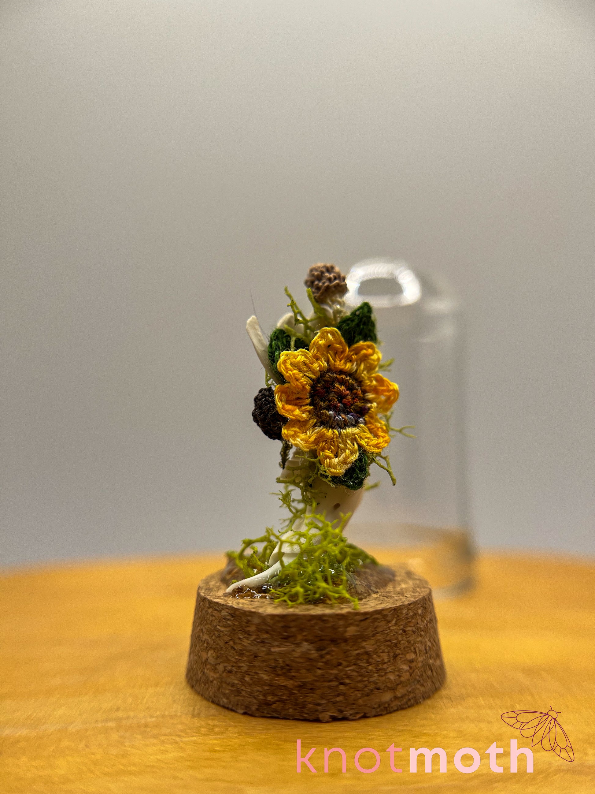 This beautifully macabre cloche jar features handmade micro-crochet sunflowers and mushrooms "growing" from an ethically sourced jawbone dissected from owl pellets.