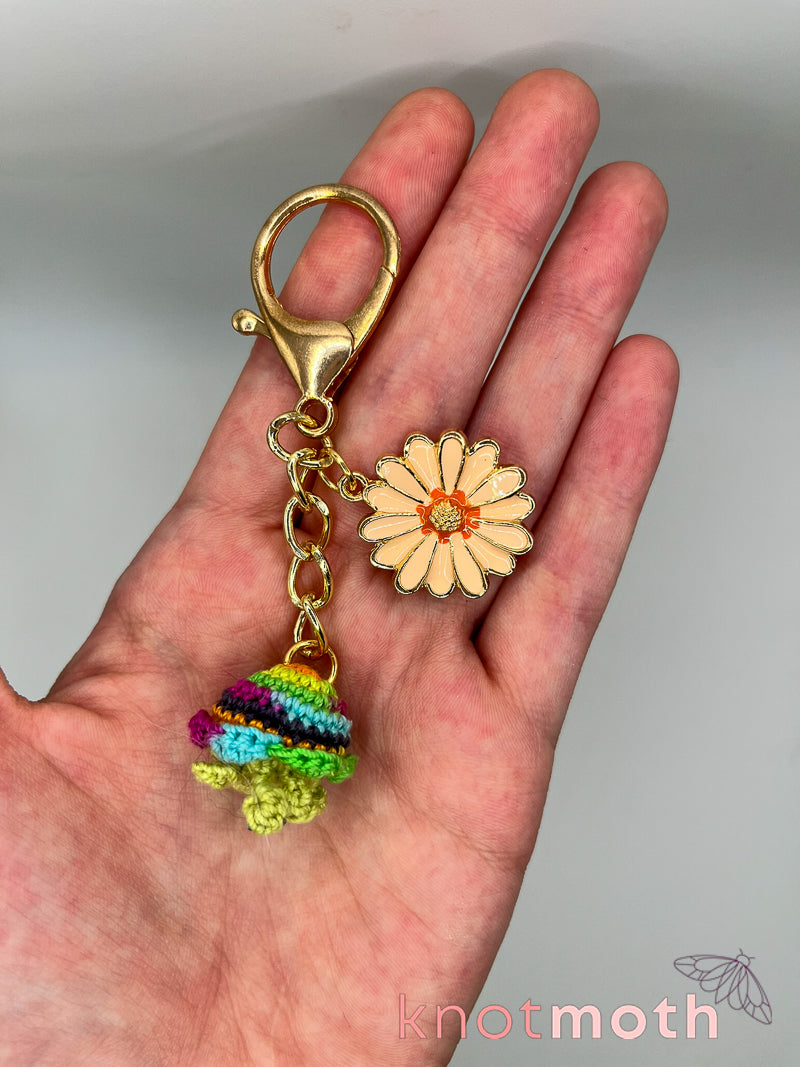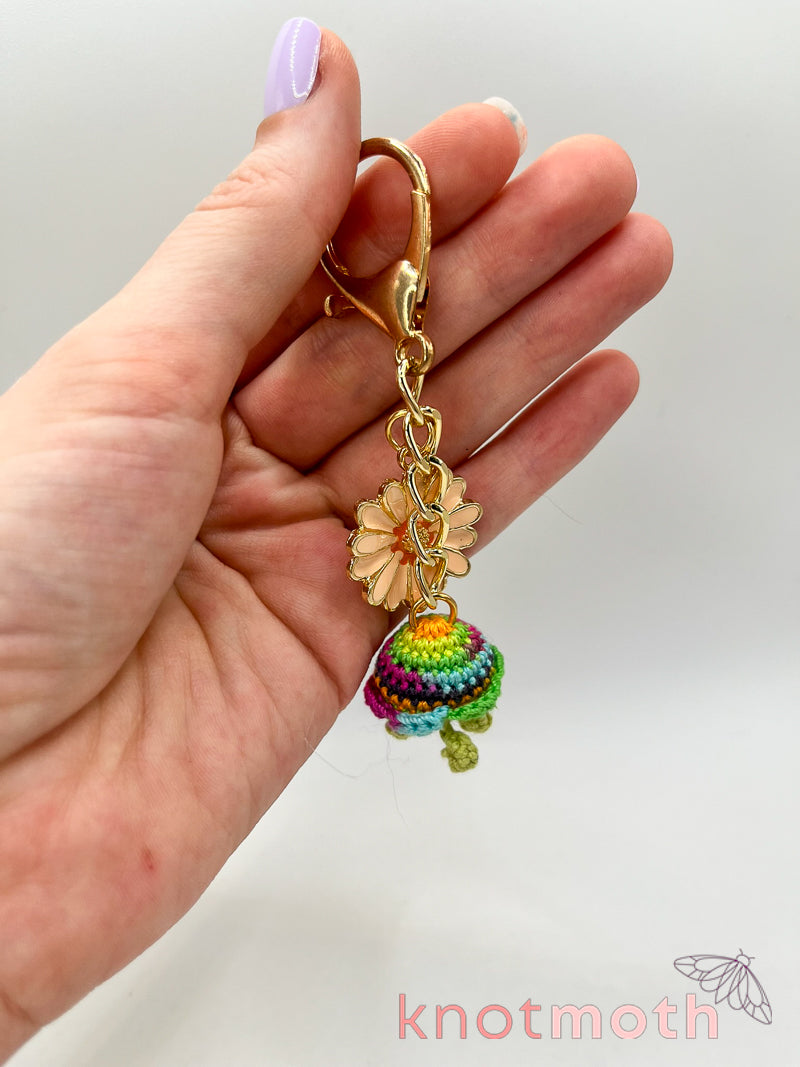 This adorable micro crochet turtle and flower charm keychain is the perfect handmade accessory that will bring a smile to your face each time you reach for your keys!