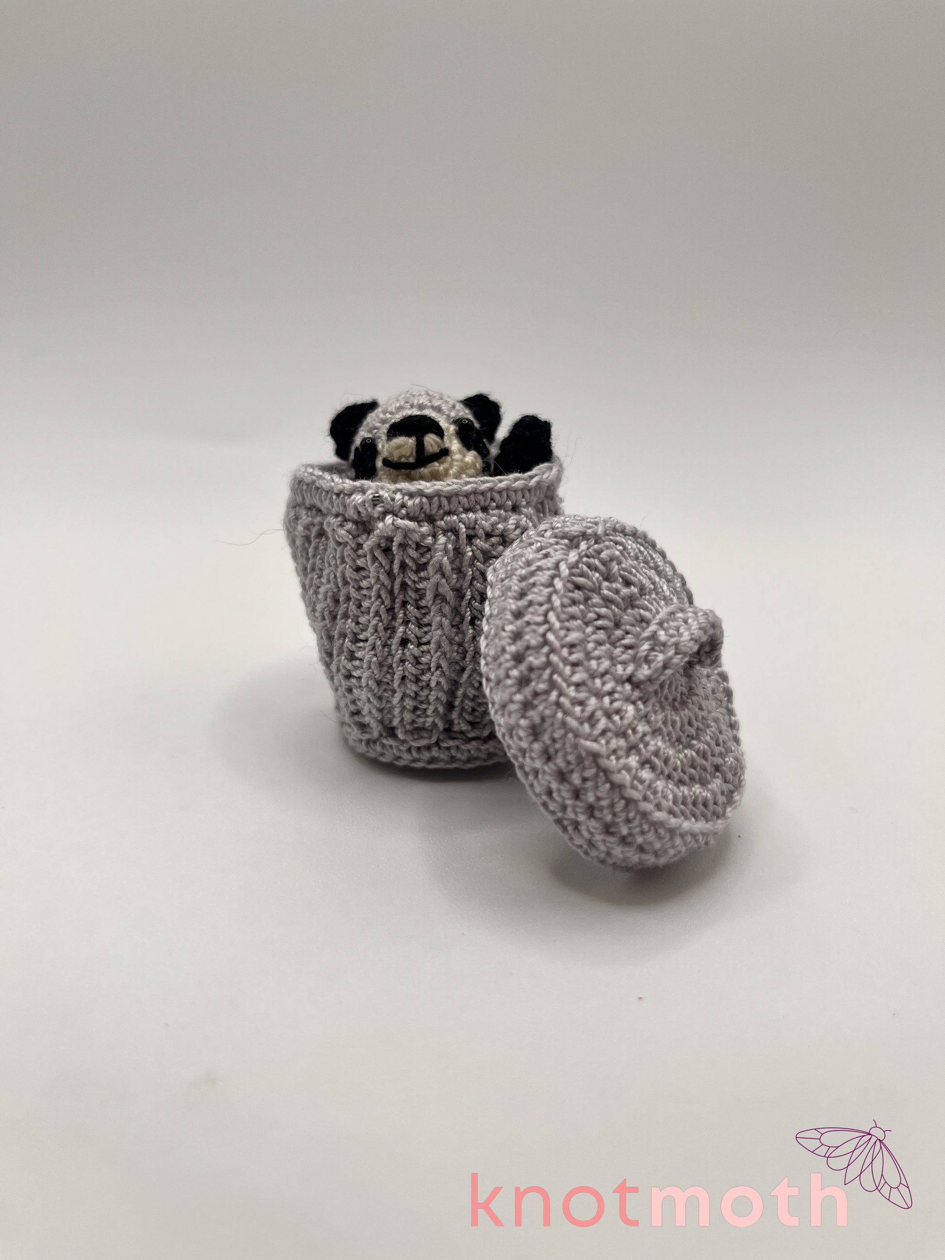 You can remove the micro raccoon from the crocheted trashcan to admire the hand-stitched details more closely.