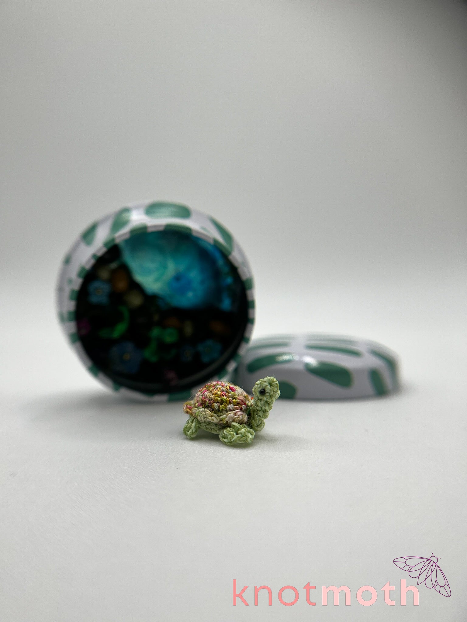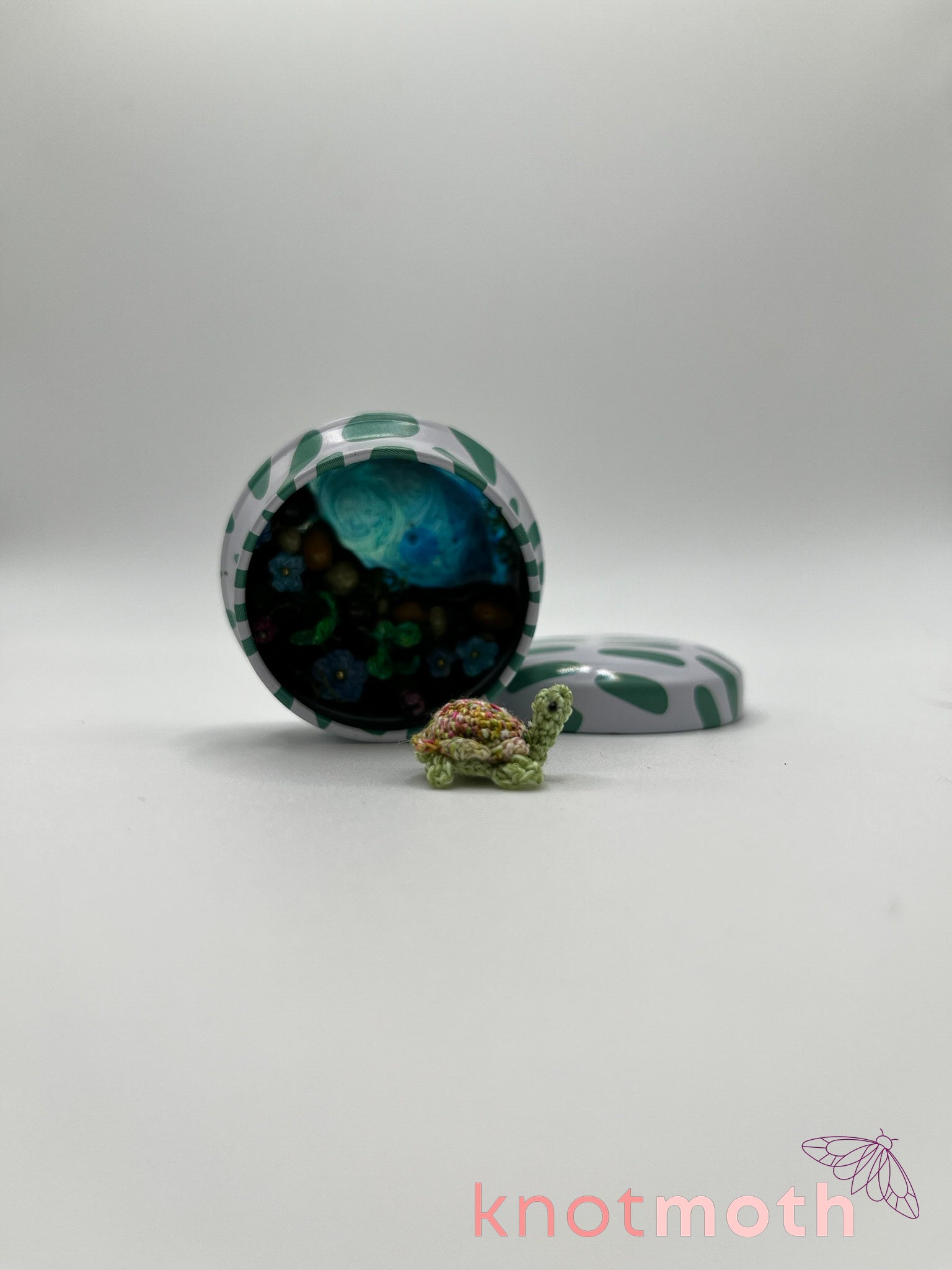 tashi turtle & garden pond scene micro crochet tin