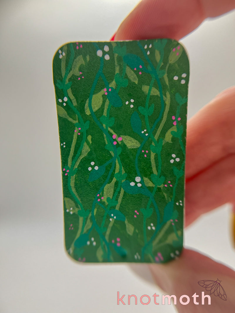 Thread, microbeads, magnets, yarn stuffing, metal wire, resin, dye, glue, moss, fake grass, rocks, sand, acrylic paint and varnish on the lid