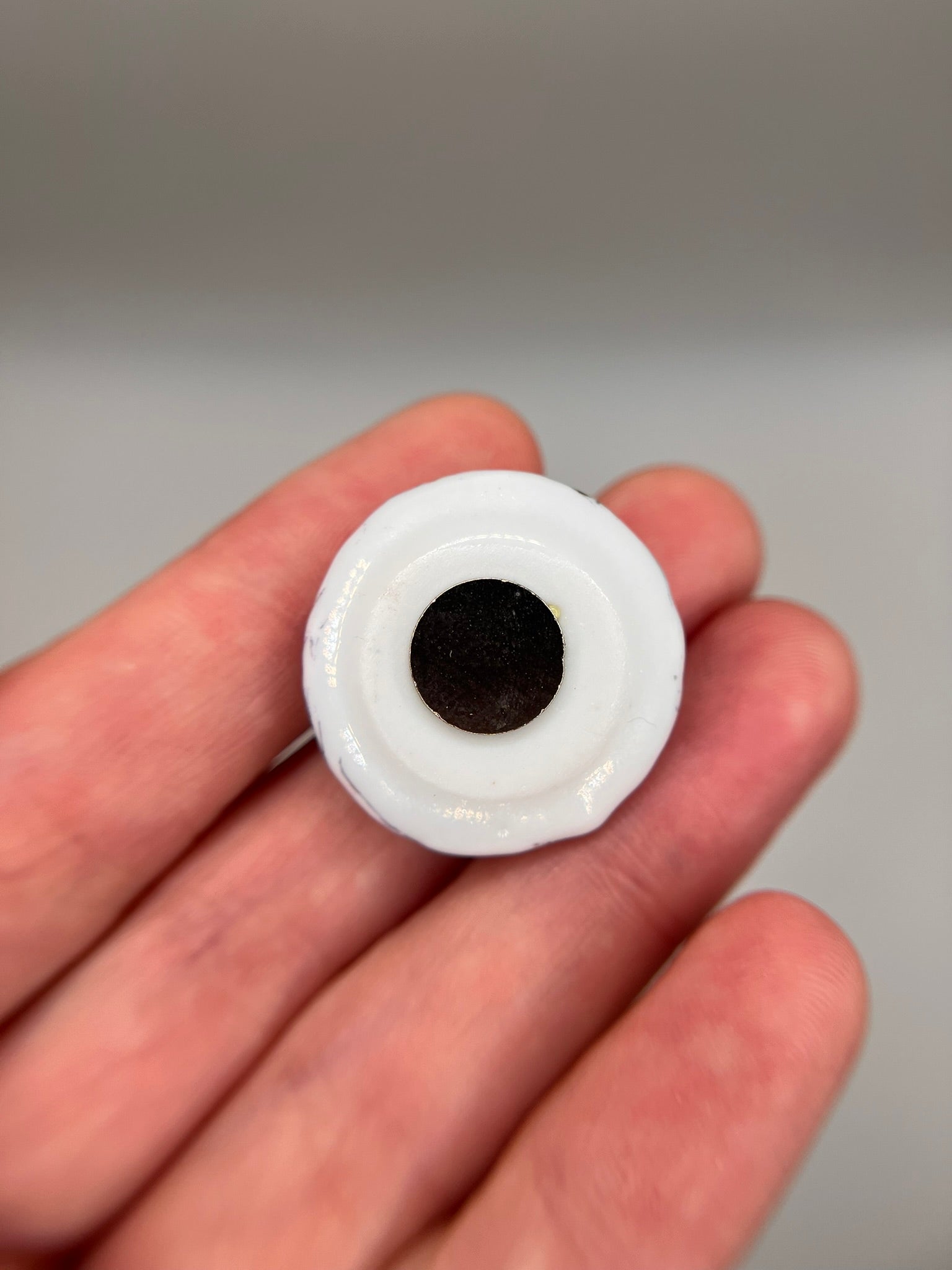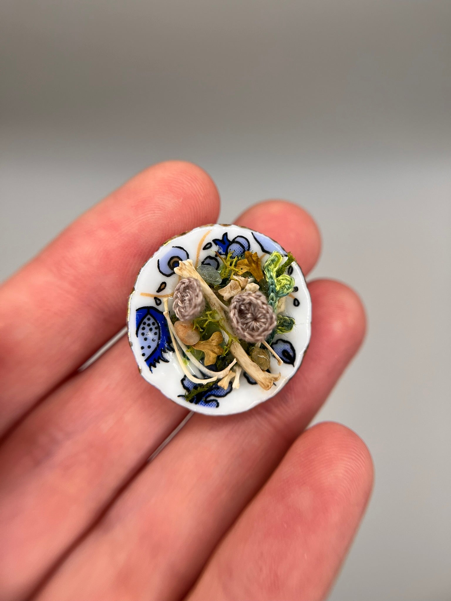 Bones harvested from owl pellets, cotton thread, crystal chips, microbead, moss, glue, miniature ceramic plate, magnet