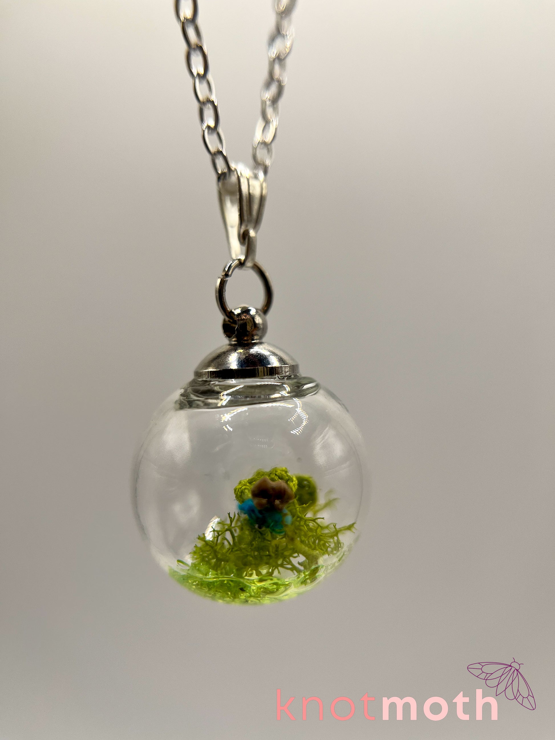 bone dissected from owl pellets, thread, moss, resin glue, zinc alloy metal necklace, metal loop, glass globe with metal hardware