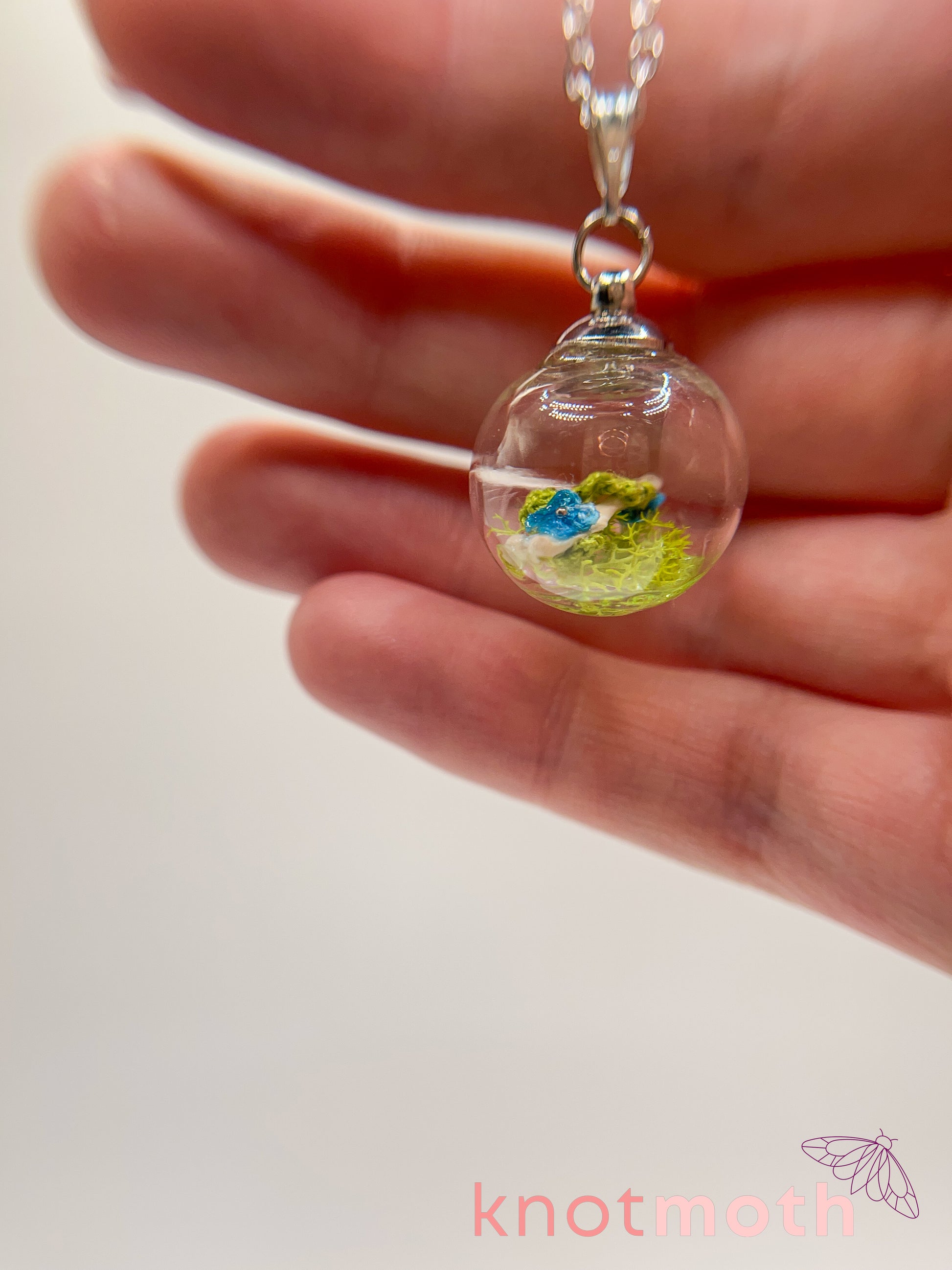 This one-of-a-kind micro-crochet globe necklace with blue creeping speedwell (veronica) flowers and a tiny femur bone ethically sourced from dissected owl pellets is the perfect accessory for anyone who loves beautifully macabre handmade jewelry!