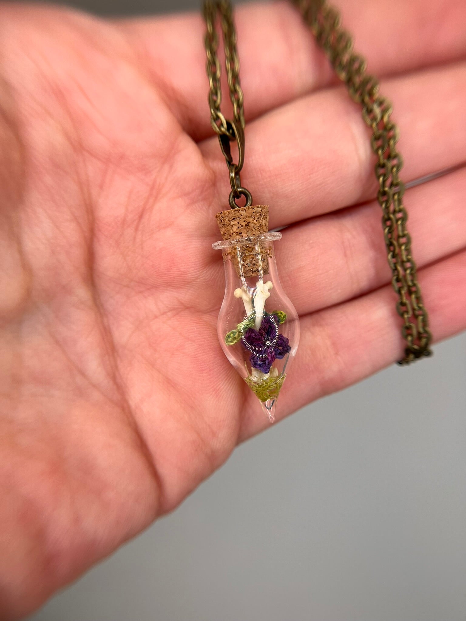 This one-of-a-kind miniature bone garden mini jar necklace captures the quiet beauty of life growing from what remains.